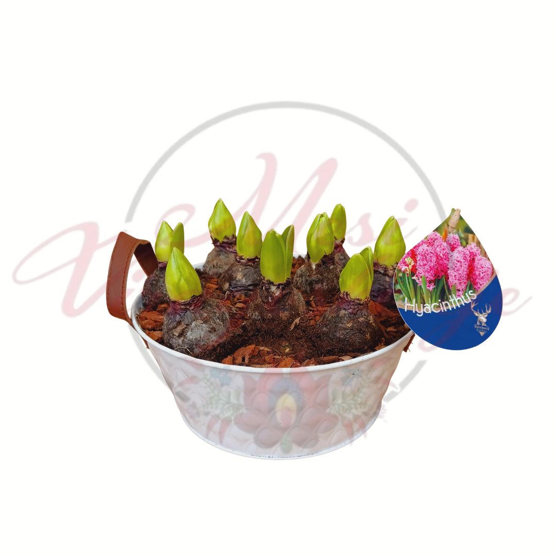 A jácint, latin nevén Hyacinthus orientalis, az egyik legismertebb és legkedveltebb tavaszi hagymás növény. Ebben a kompozícióban kilenc erős hagyma került egy dekoratív kaspóba, így virágzáskor különösen gazdag, tömött és illatos látványt nyújt. A több töves összeültetés intenzív színhatást és hosszan tartó díszítőértéket biztosít.