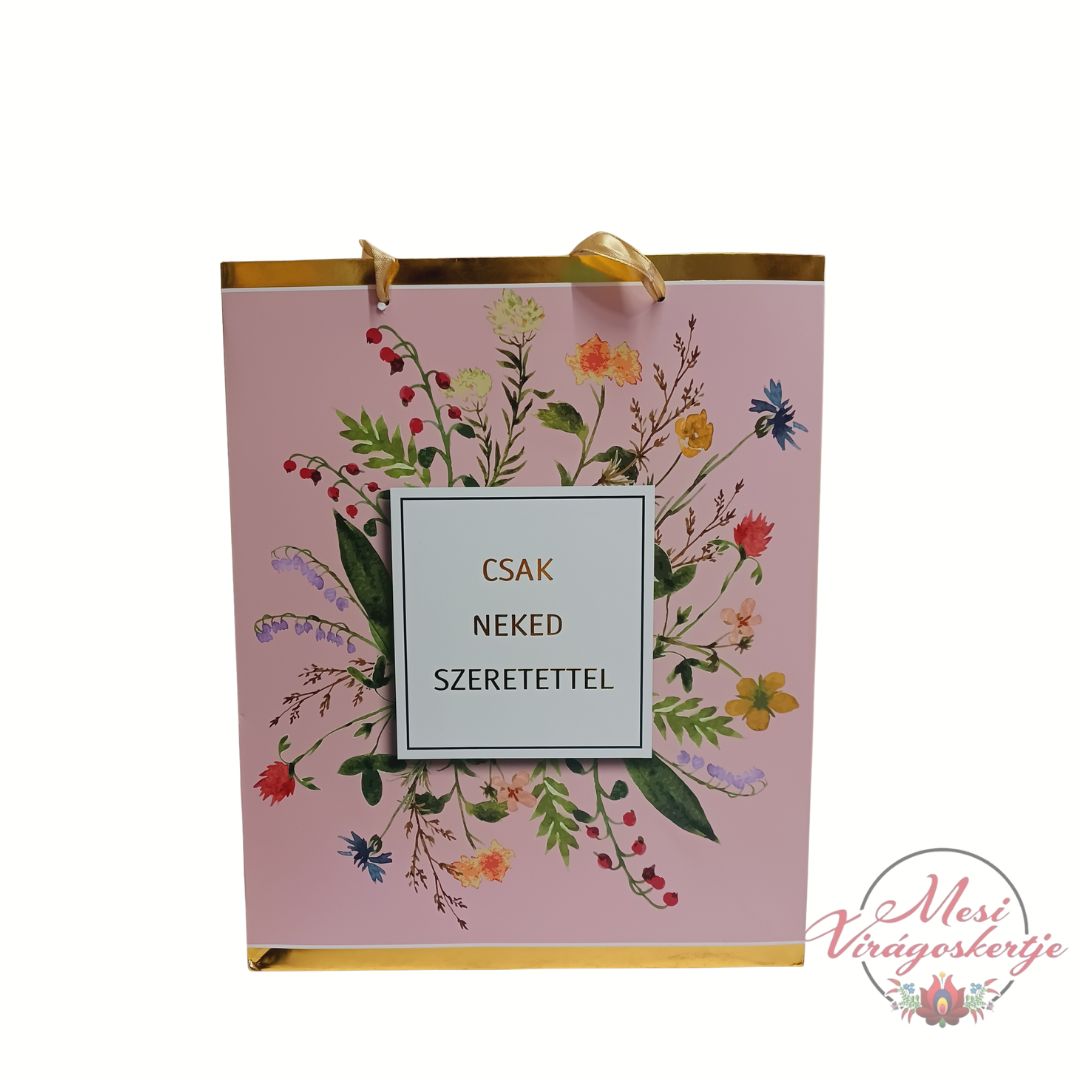 Ez a virágmintás ajándéktáska tökéletes választás, ha az ajándékozás mellé egy kedves üzenetet is szeretnél átadni. A termék kétféle változatban érhető el: „Csak neked szeretettel” és „Nagy szeretettel neked” felirattal, így könnyedén kiválasztható az alkalomhoz leginkább illő verzió.