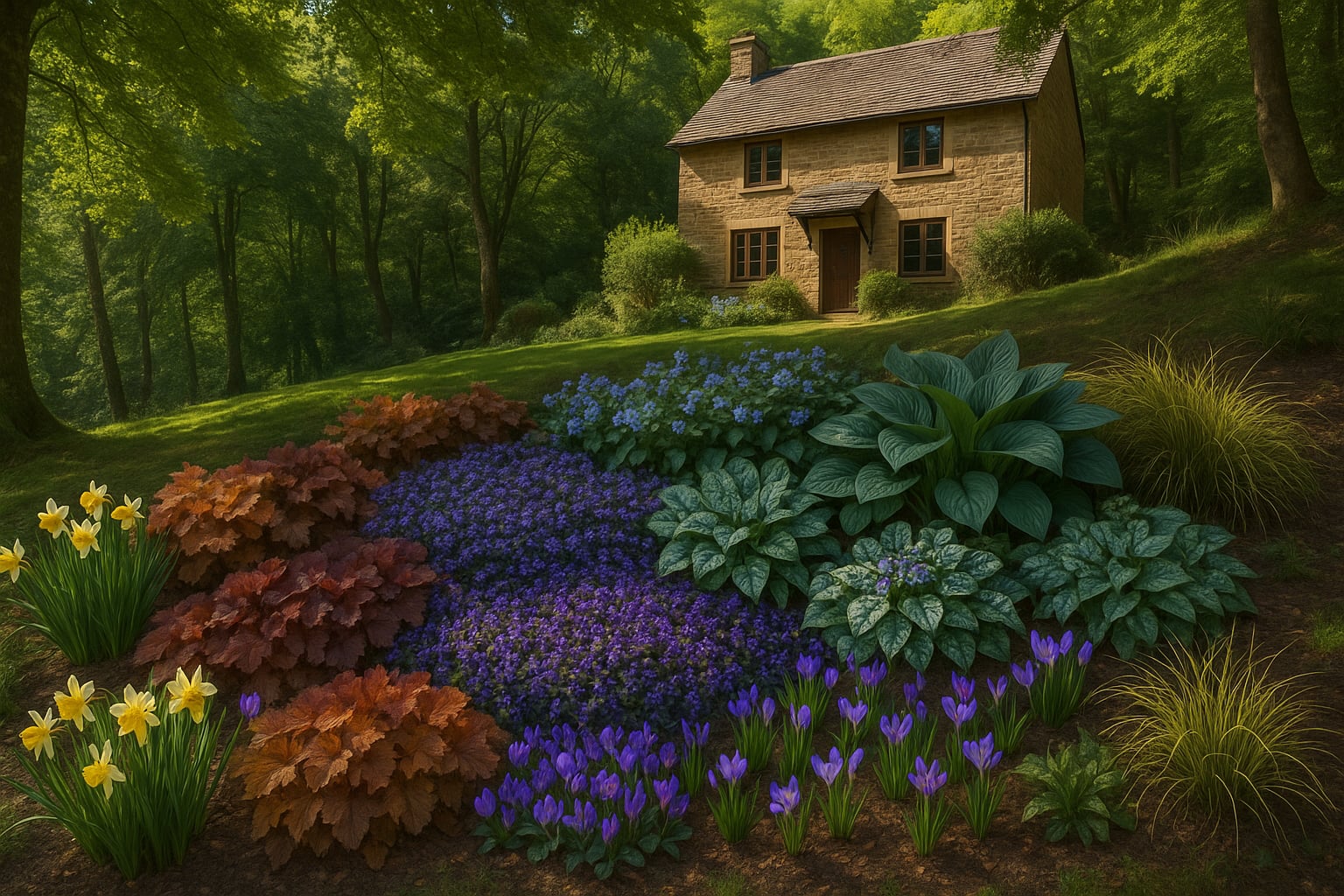 • Pulmonaria (tüdőfű): Tarka levelei és tavaszi virágzása harmonikusan egészíti ki az Ajuga lila virágtüskéit