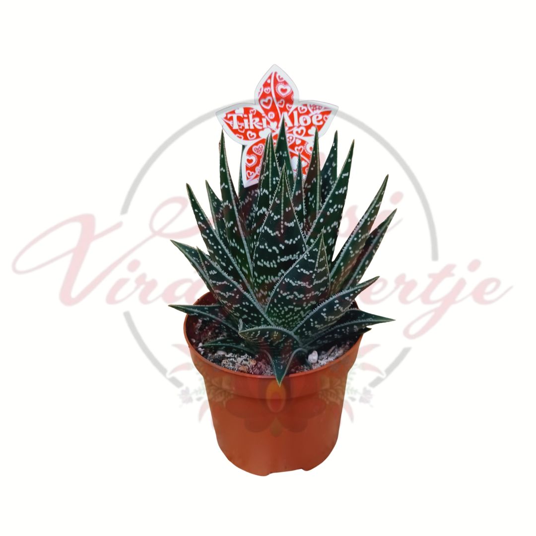 Az Aloe Tiki egy különleges megjelenésű, kompakt méretű díszaloé fajta, amely látványos mintázatával azonnal magára vonja a figyelmet. Vastag, húsos levelein világos és sötét zöld foltok váltakoznak, így modern és természetes hatást kelt egyszerre.