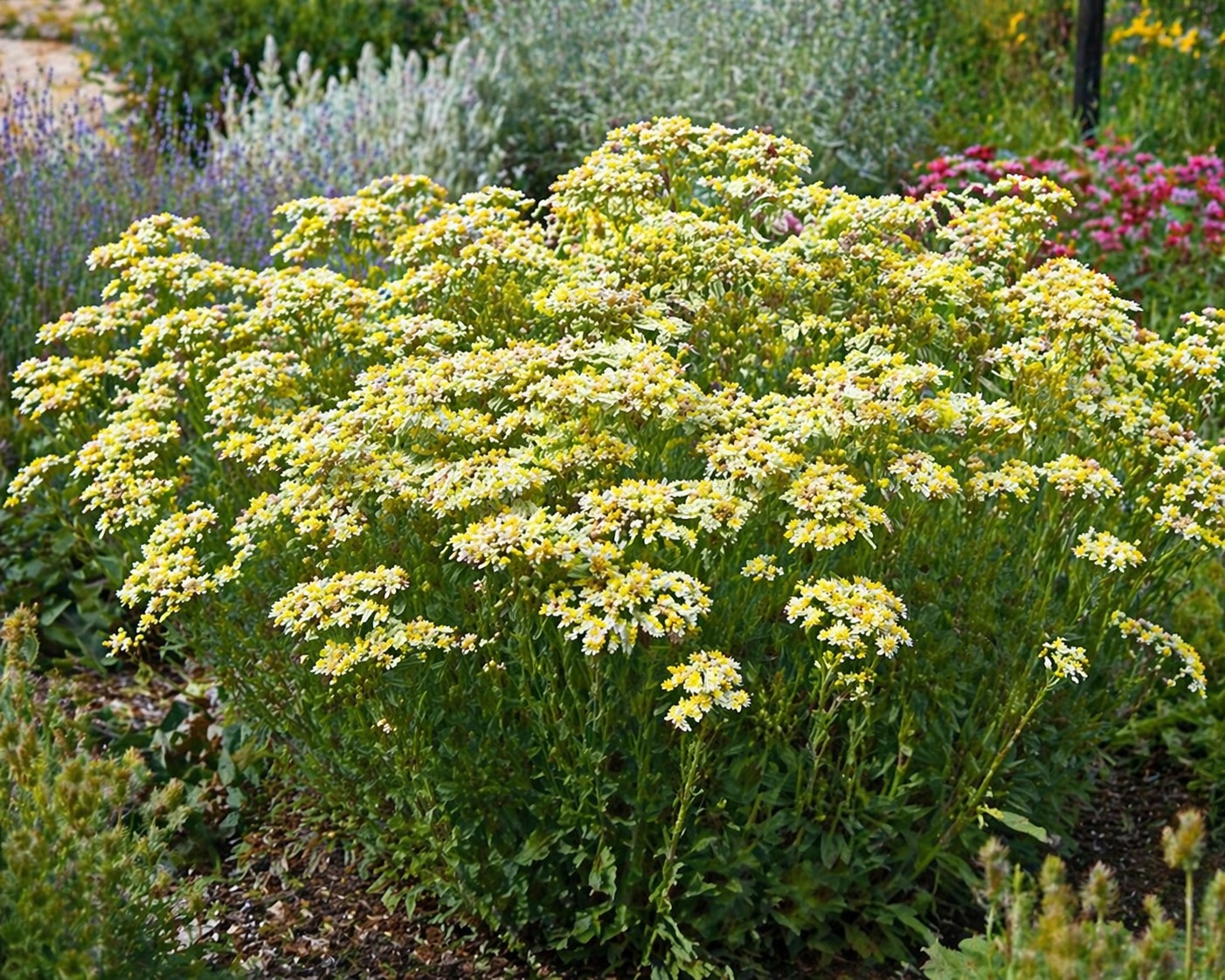 Az Aranyvessző (Solidaster luteus ‘Lemore’) egy különleges, hosszan virágzó évelő dísznövény, amely a vesszőrózsa és az őszirózsa keresztezéséből származik. Laza, természetes hatású megjelenése és finom szerkezetű, apró sárga virágai miatt kiváló választás virágágyásokba és vegyes évelő kertekbe.