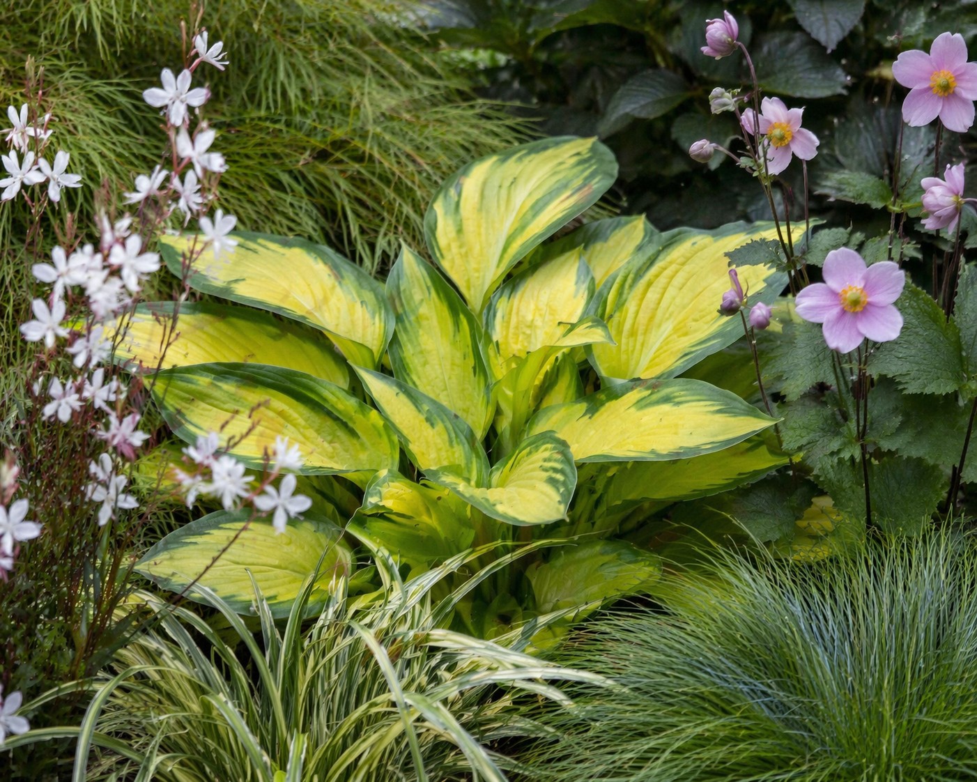 Látványos, sárga-zöld levelű árnyékliliom, amely feldobja az árnyékos kertrészeket.