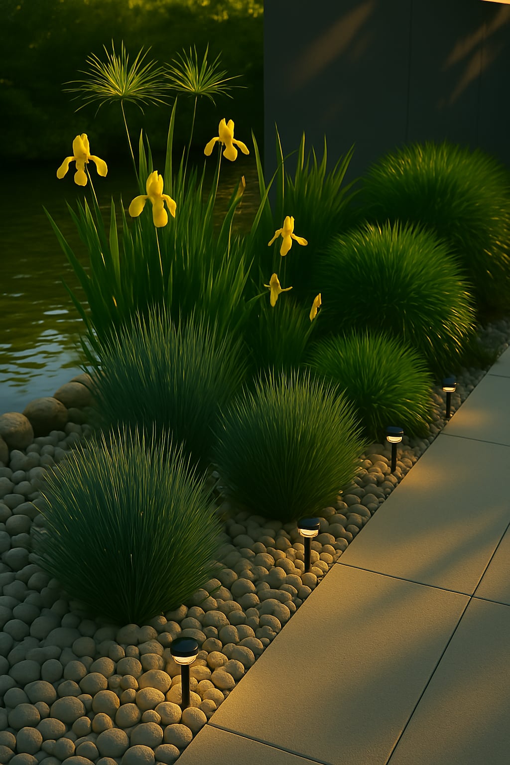 • Sásfélék – Carex spp.: természetes átmenetet képeznek a part és a víz között. Ezekkel a növényekkel készített kerttervünket megtalálod a képek között – modern, mégis organikus összhatású kompozíció.