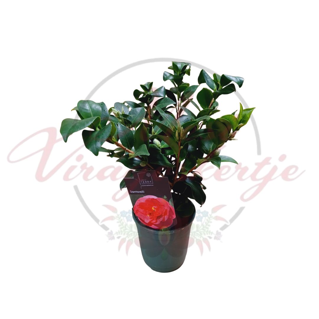 A kamélia ‘Santorelli’ – Camellia japonica – elegáns, telt virágú fajta, amely különleges szépségével és fényes örökzöld lombozatával az egyik legkedveltebb kamélia fajta. Tél végétől kora tavaszig virágzik, gazdag színű, dekoratív virágai pedig hosszan díszítenek. Védett, félárnyékos környezetben érzi jól magát, ahol nem éri tűző napsütés. Savanyú talajt, egyenletes páratartalmat igényel, és cserepes növényként teraszon, bejárat mellett vagy világos szobai környezetben is nevelhető. Igényes, de rendkívül hálás növény, amely megfelelő gondozással évről évre gazdagon virágzik.