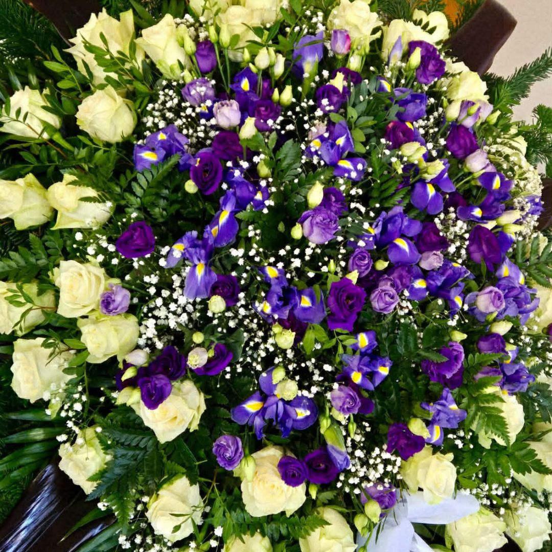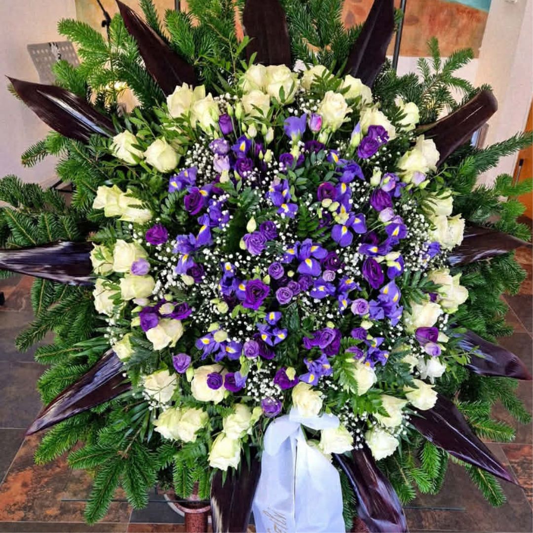 Ez a 150 cm-es családi kegyeleti koszorú méltó és ünnepélyes választás végső búcsú alkalmára. A kompozíció központi elemei a tisztaságot és békét jelképező fehér rózsák, melyeket a méltóságot sugárzó lila íriszek és liziantuszok egészítenek ki.