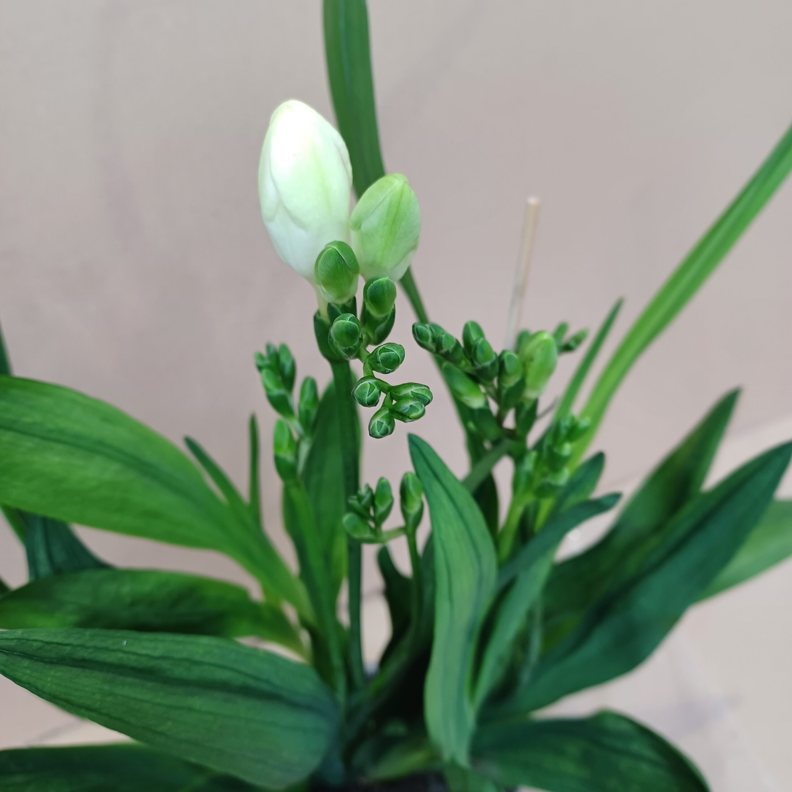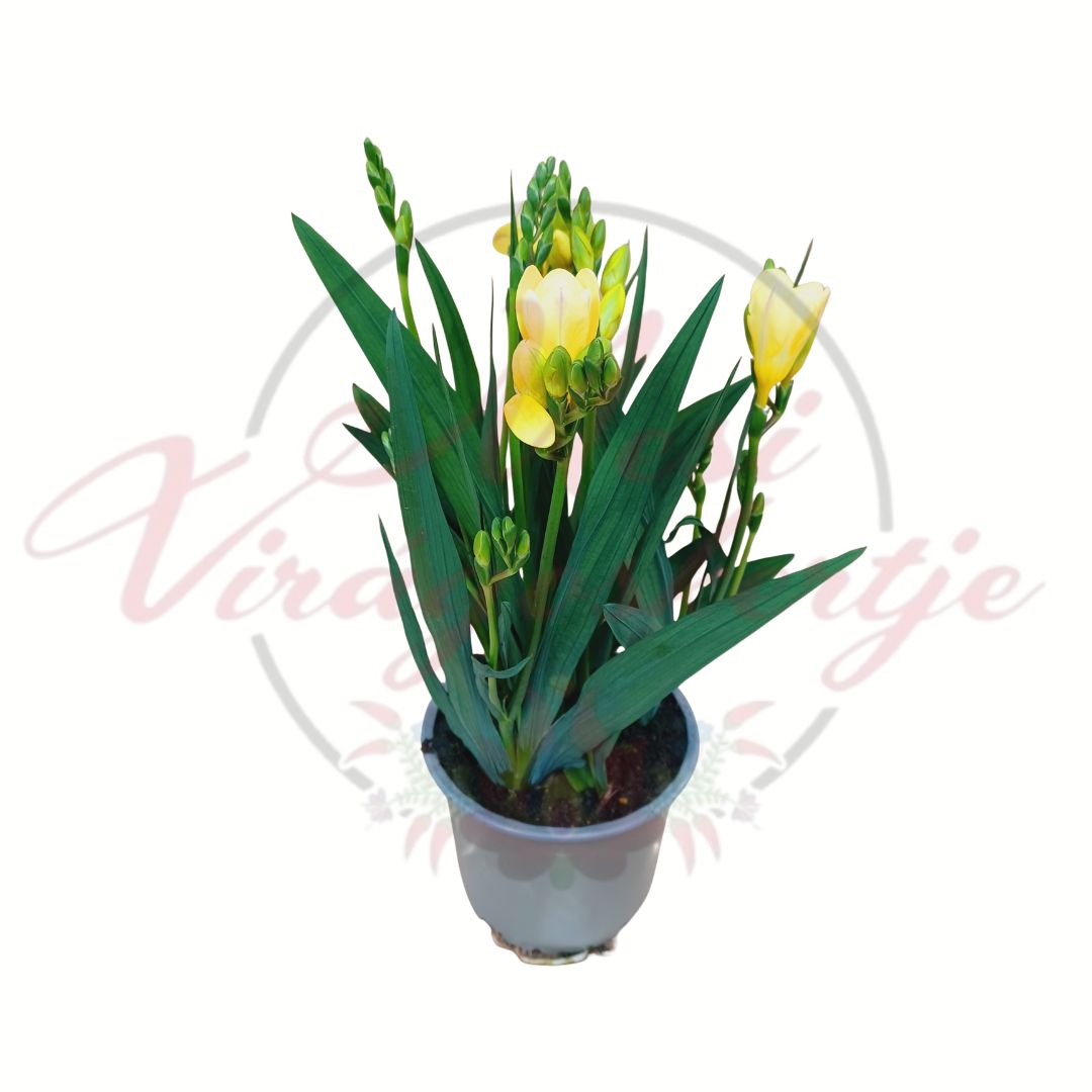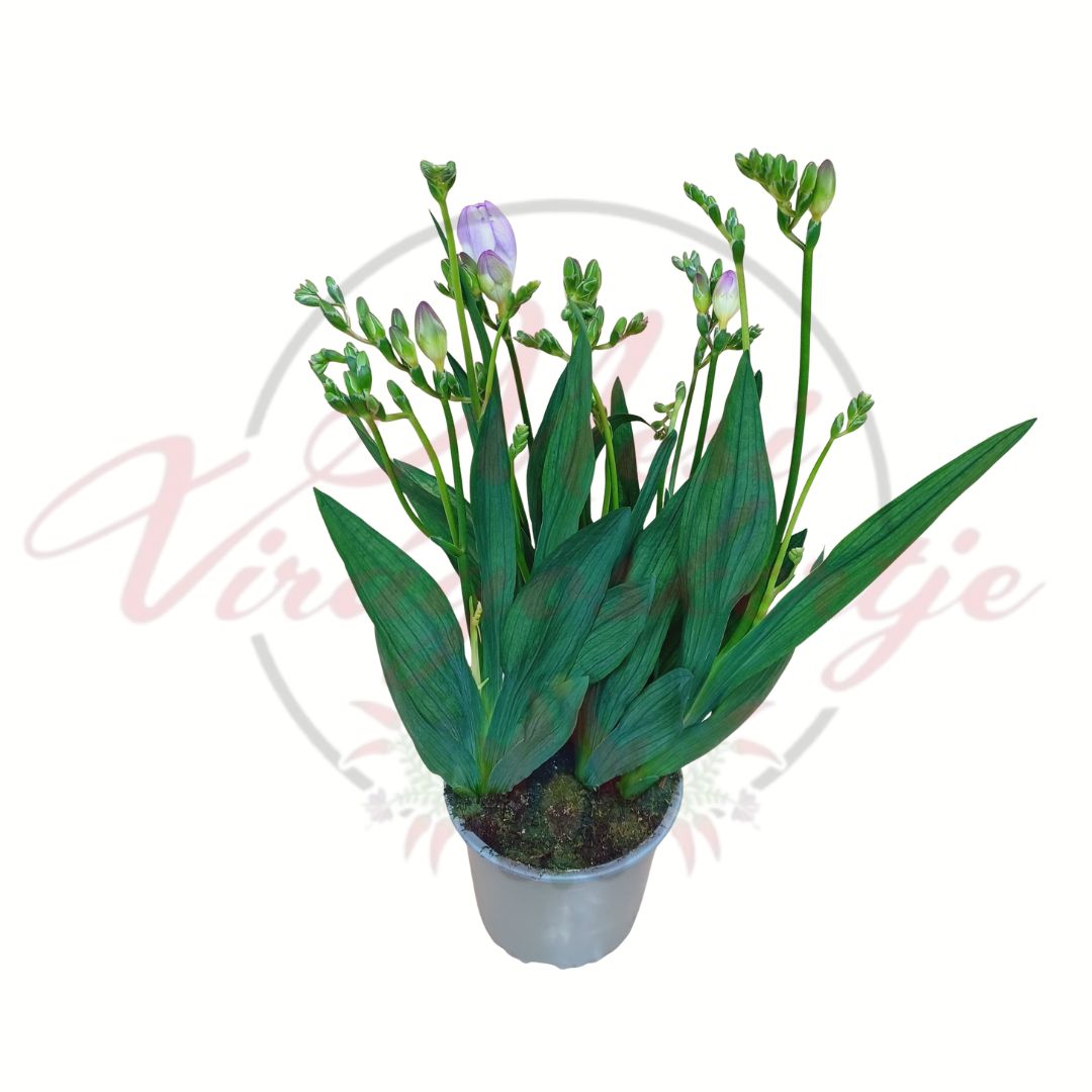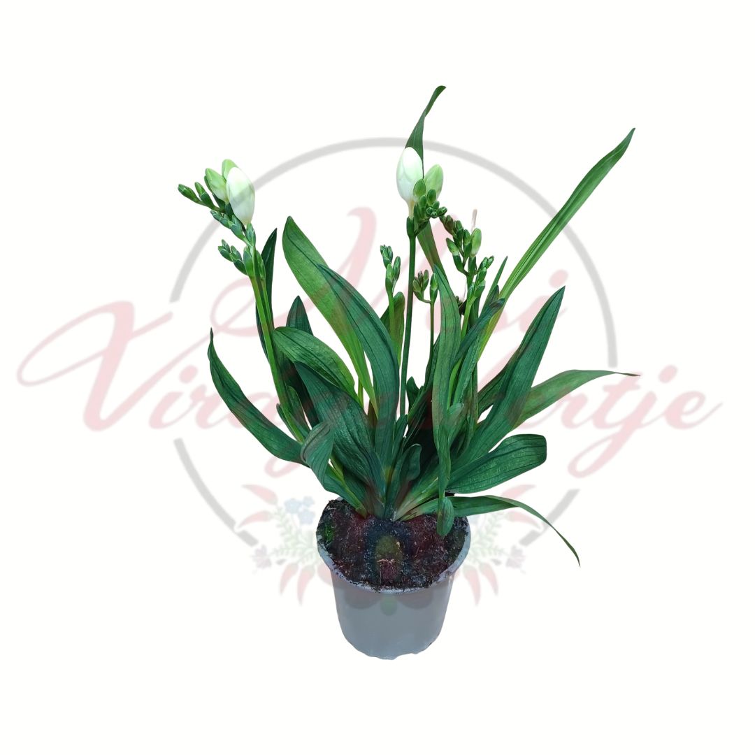 A frézia finom illatáról és elegáns virágairól ismert hagymás növény, amely cserepes formában is rendkívül dekoratív. Karcsú, élénkzöld levelei közül emelkednek ki a bimbós, majd fokozatosan nyíló virágszárak, amelyek fehér, sárga, lila vagy pasztell árnyalatokban pompáznak. Letisztult megjelenése miatt kiváló választás világos belső terekbe, tavaszi asztaldíszként vagy ajándékként is.