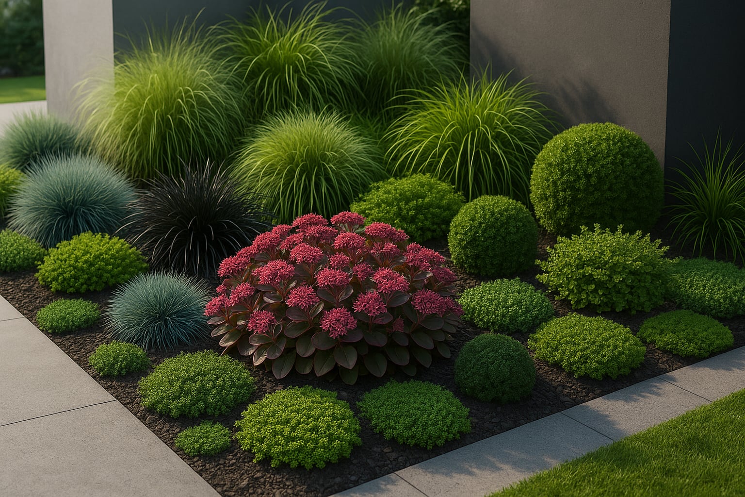 • Kék csenkesz (Festuca glauca) – ezüstös-kék párnák, geometrikus hatás