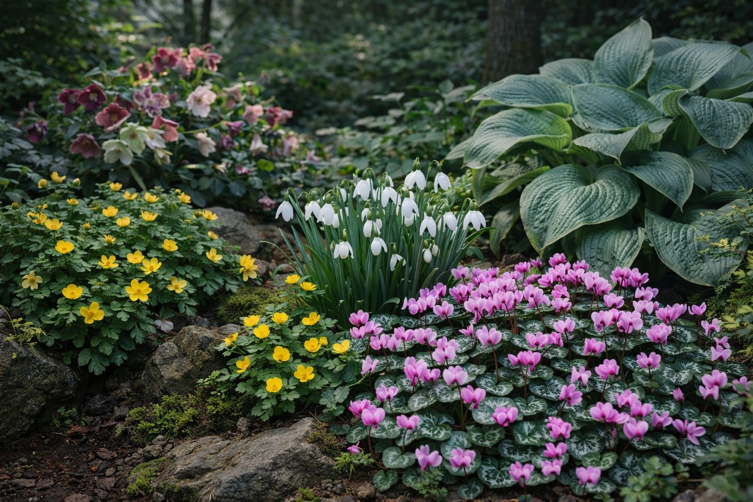 A erdei ciklámen ‘változatok’ (Cyclamen coum) alacsony termetű, gumós évelők, amelyek a tél végén és kora tavasszal hozzák finom, felfelé álló virágaikat.