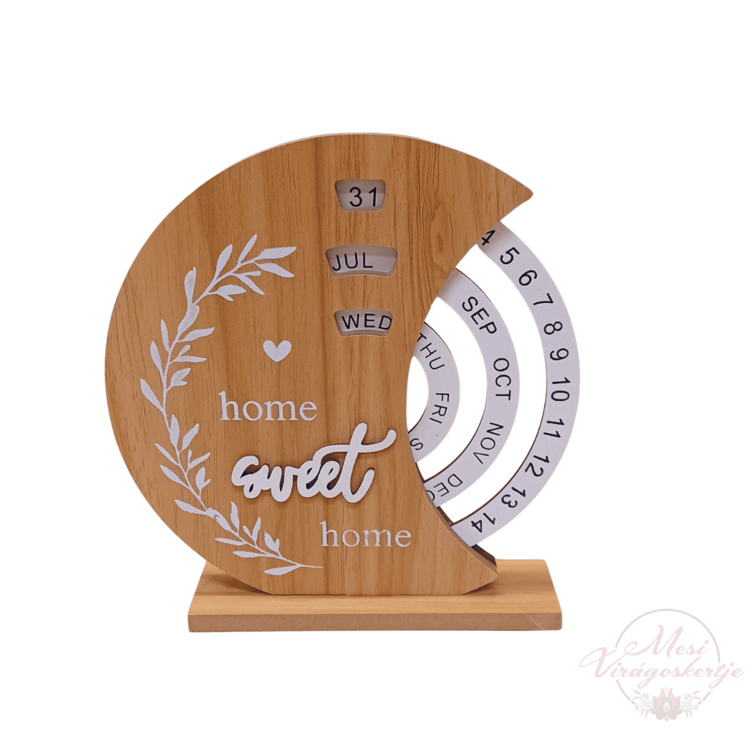 Fából készült öröknaptár „Home Sweet Home” felirattal. Dekoratív, praktikus és környezettudatos kiegészítő minden otthonba.