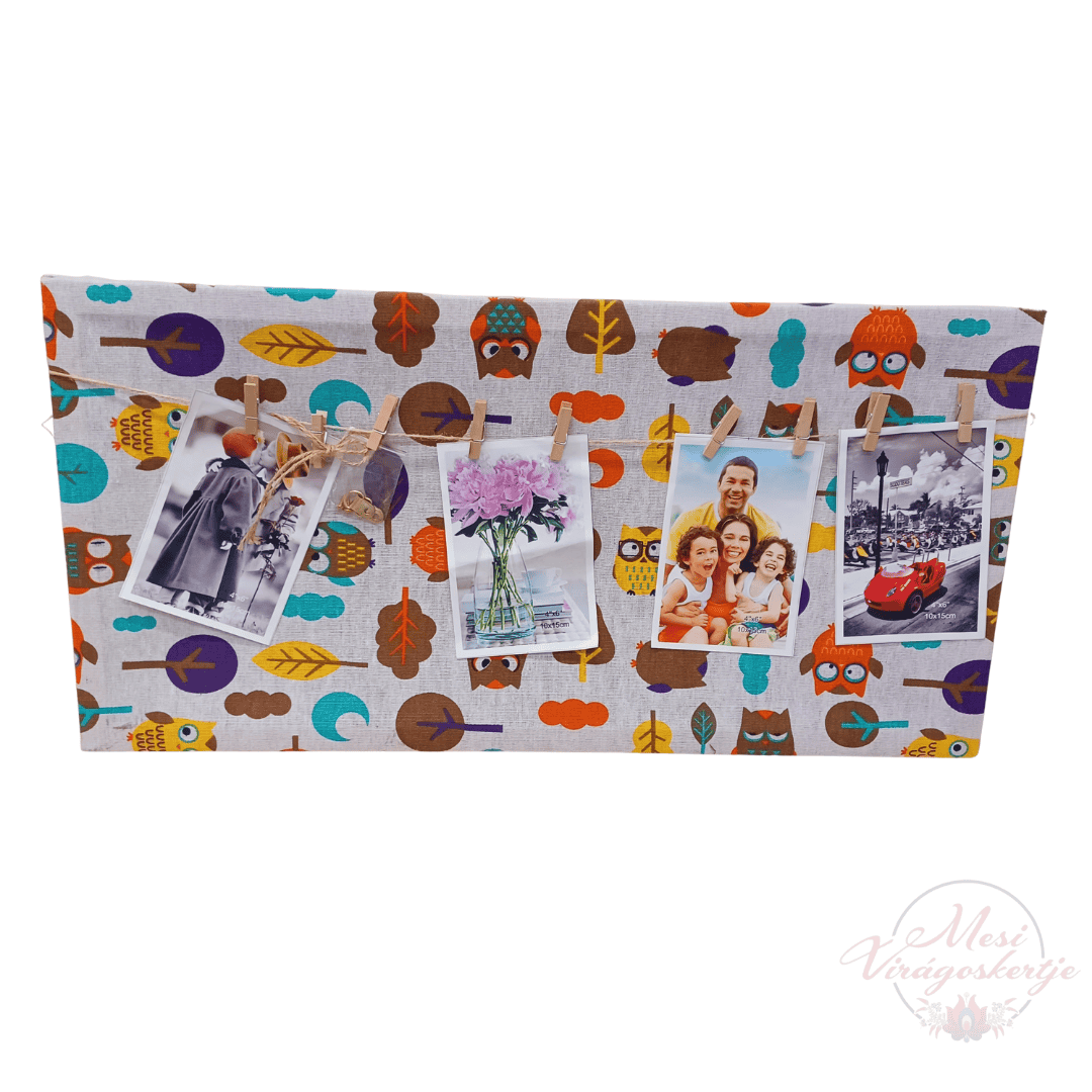 Vidám mintás fali fényképtartó csipeszekkel, amellyel fényképeket, rajzokat vagy apró emlékeket mutathatsz meg egyedi, hangulatos módon.