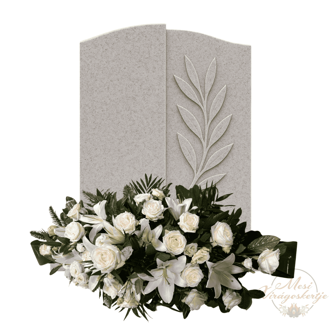 Ez a fehér sírpárna élővirágokból a megemlékezés és tiszteletadás egyik legszebb formája. A kompozícióban fehér liliomok, rózsák és szezonális virágok kaptak helyet, melyeket zöld lomb és fenyőágak egészítenek ki. A virágok szimmetrikusan, sűrűn elrendezve alkotnak egy elegáns, visszafogott megjelenésű sírdíszt, amely méltó módon fejezi ki az emlékezés érzését.