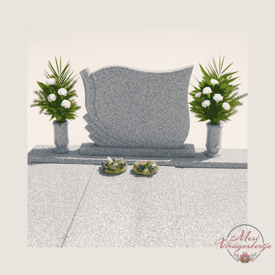 Ez a fehér vázacsokor páros elrendezésben készült, amely harmóniát és méltóságot sugároz a világos szürke gránit síremléken. A kompozíció alapját a fehér virágok adják, amelyek a tisztaságot, szeretetet és békét jelképezik. A pálmalevelek és zöld díszítések ünnepélyes és klasszikus hatást biztosítanak.