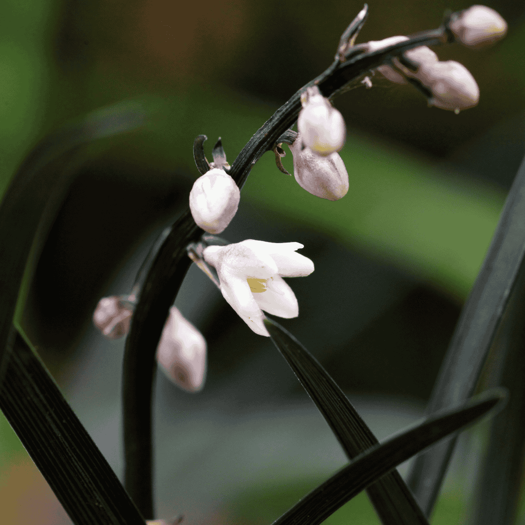 Az Ophiopogon planiscapus ‘Niger’, közismert nevén fekete kígyószakáll, egy különleges megjelenésű, alacsony növekedésű évelő, amelyet szinte fekete, keskeny levelei és apró rózsaszín virágai tesznek igazán egyedivé. Halvány rózsaszínű, harang alakú virágai általában július–augusztus folyamán jelennek meg. A virágok aprók, de dekoratívak, és sötét bordó virágzati száron emelkednek kissé a levelek fölé. Virágzás után gyakran fémesen kék bogyókat is hoz, amelyek tovább növelik a díszítőértékét. A növény kifejlett magassága általában 20–30 cm. Árnyékos vagy félárnyékos kertrészekbe, szegélyekbe, konténerbe vagy modern ágyásokba ültetve kontrasztos, elegáns hatást kelt. Jól kombinálható világos lombozatú vagy virágzó növényekkel, és minimális gondozást igényel. A dizájnos kertek kedvelt eleme, különösen japán stílusú vagy minimalista kompozíciókban.