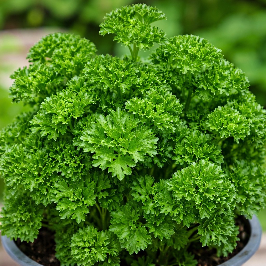 Friss, fodros levelű petrezselyem, amely ízletes és dekoratív kiegészítője a konyhának és a konyhakertnek.