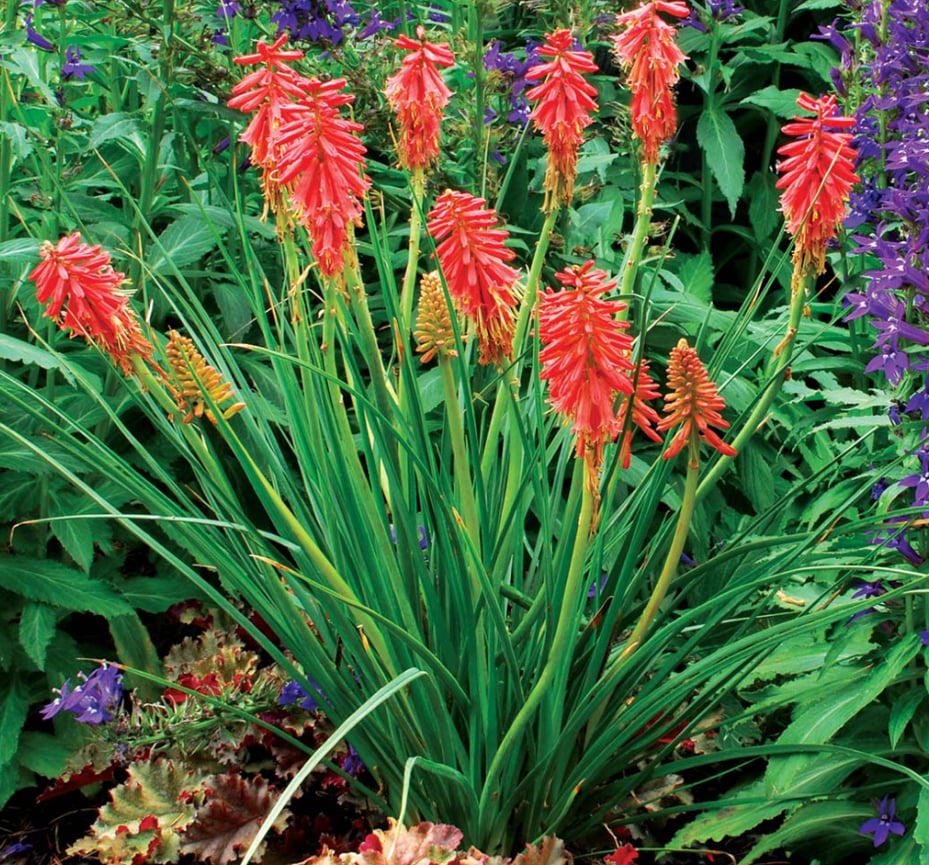 A Kniphofia ‘Redhot Popsicle’ kompakt termetű, élénk narancsvörös virágú fáklyaliliom, amely kiválóan vonzza a beporzókat és kisebb kertekben is jól mutat