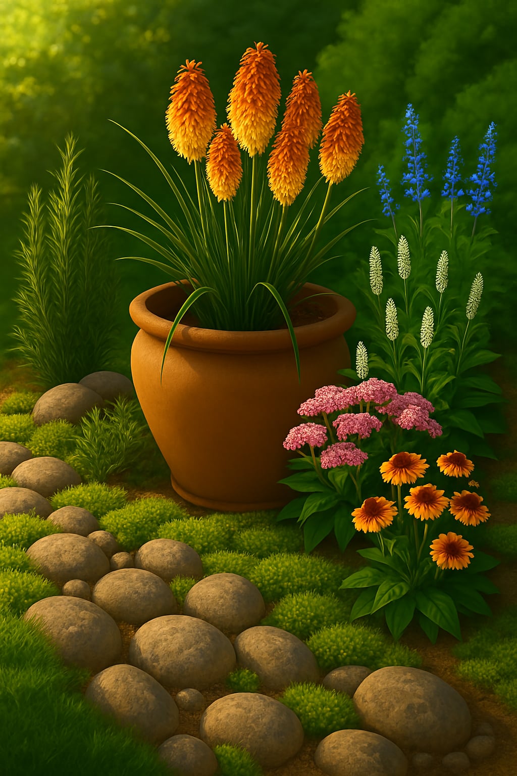 Különösen jól mutat, ha szárazságtűrő évelőkkel és aromás növényekkel kombináljuk.