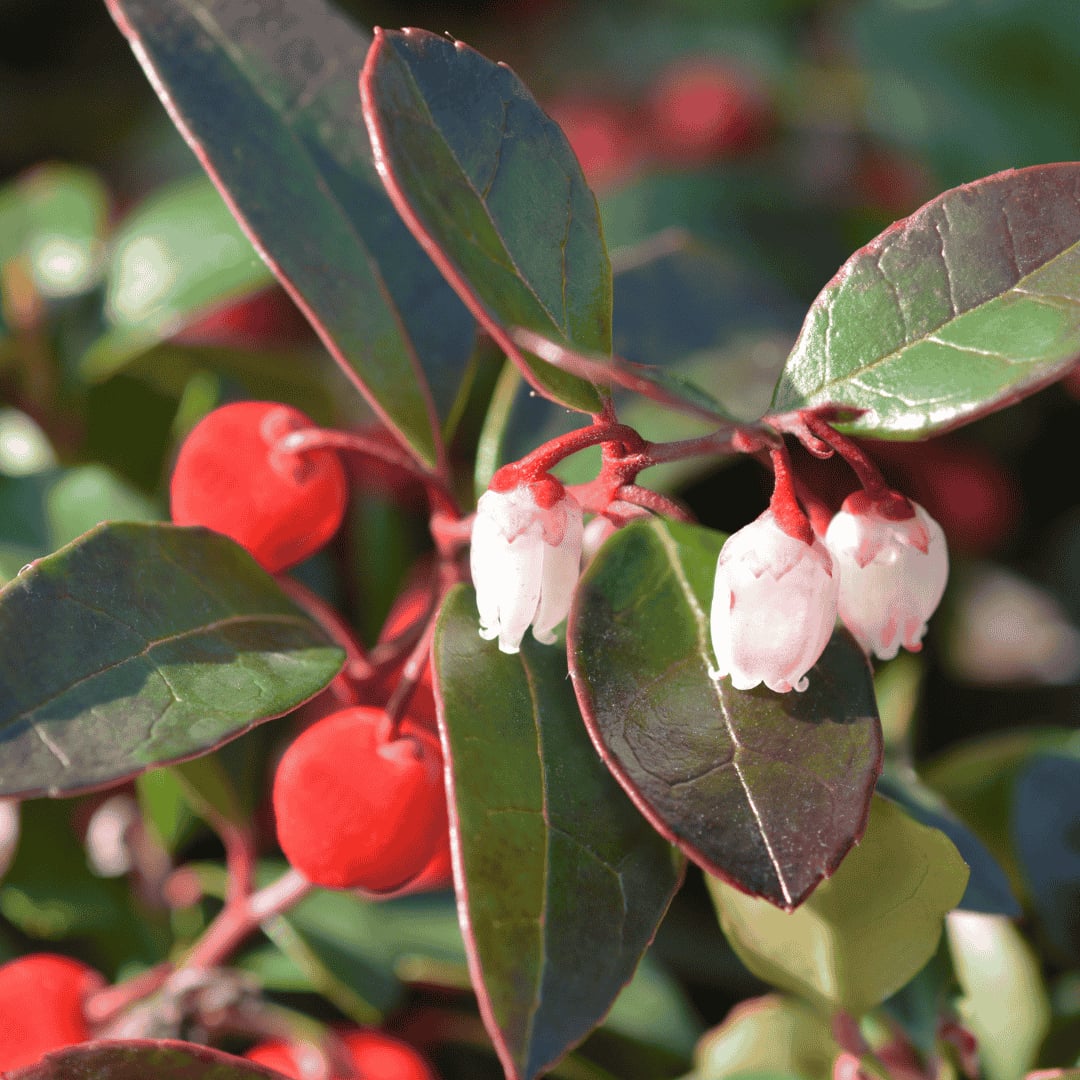 Gaultheria procumbens – alacsony növésű, örökzöld dísznövény piros bogyókkal. Tökéletes savanyú talajba, félárnyékos helyre, balkonra vagy sziklakertbe.