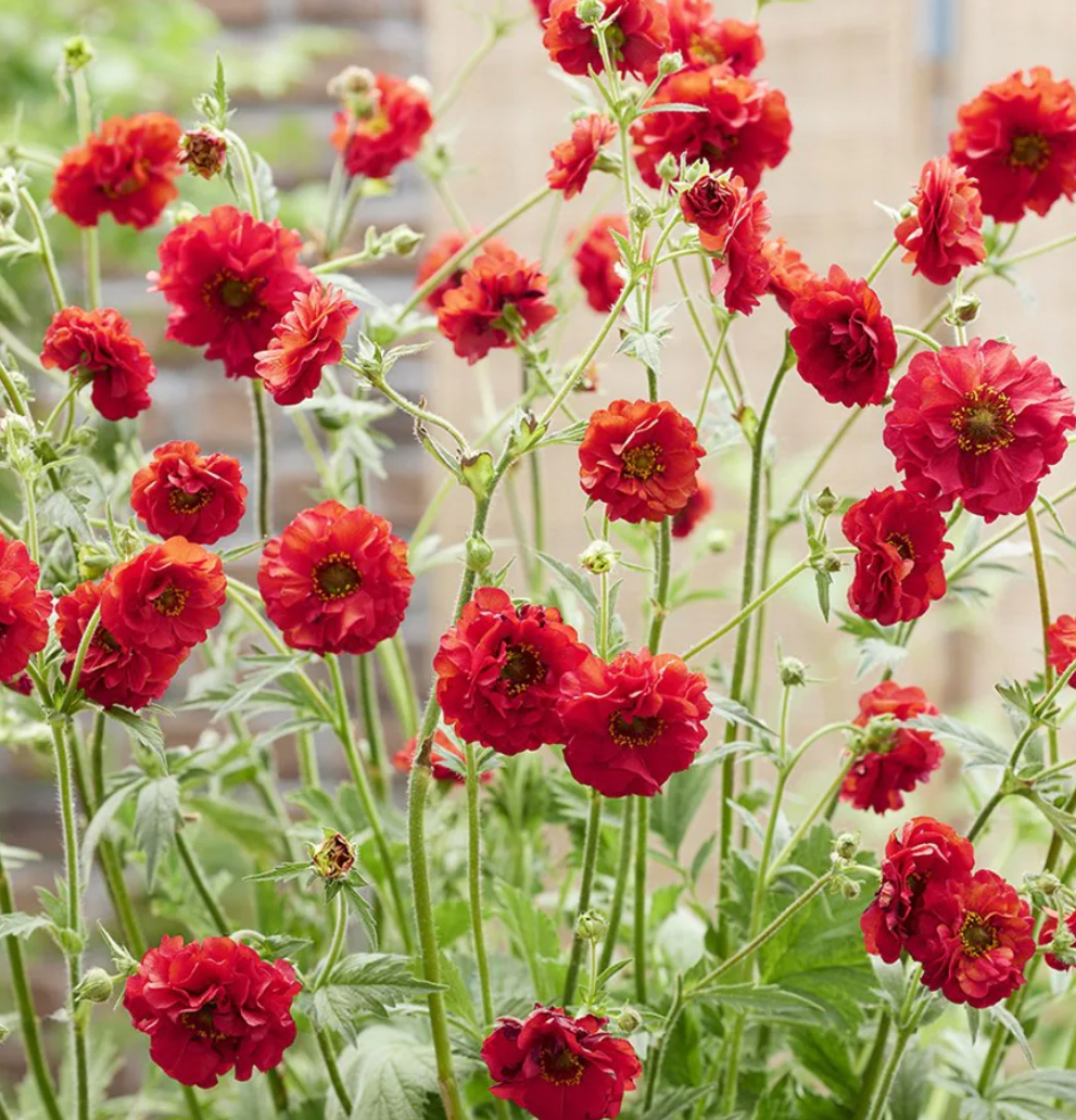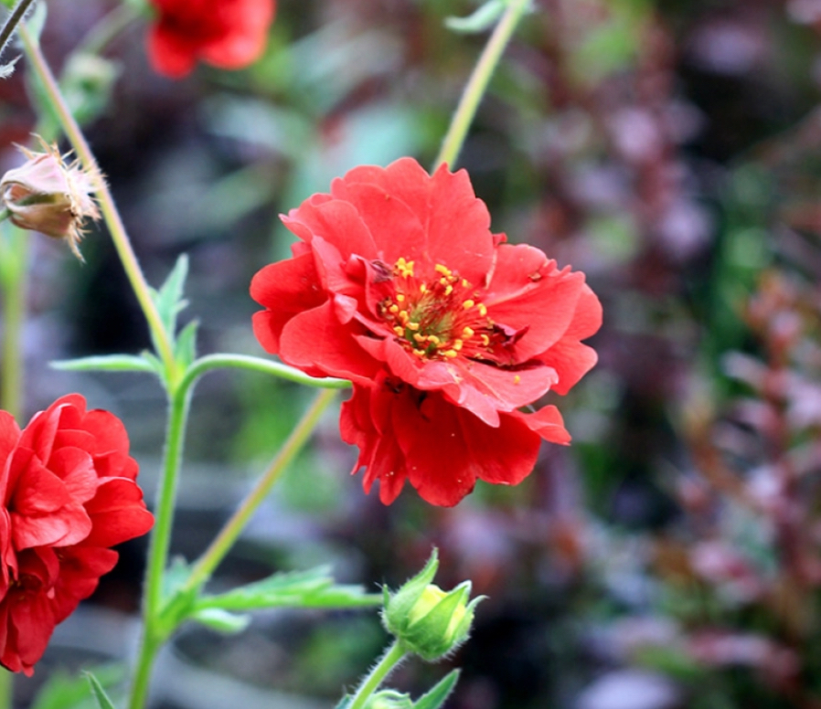 • Pompás keserűfű – Persicaria amplexicaulis: élénk virágaival harmonikusan egészíti ki a piros geumot