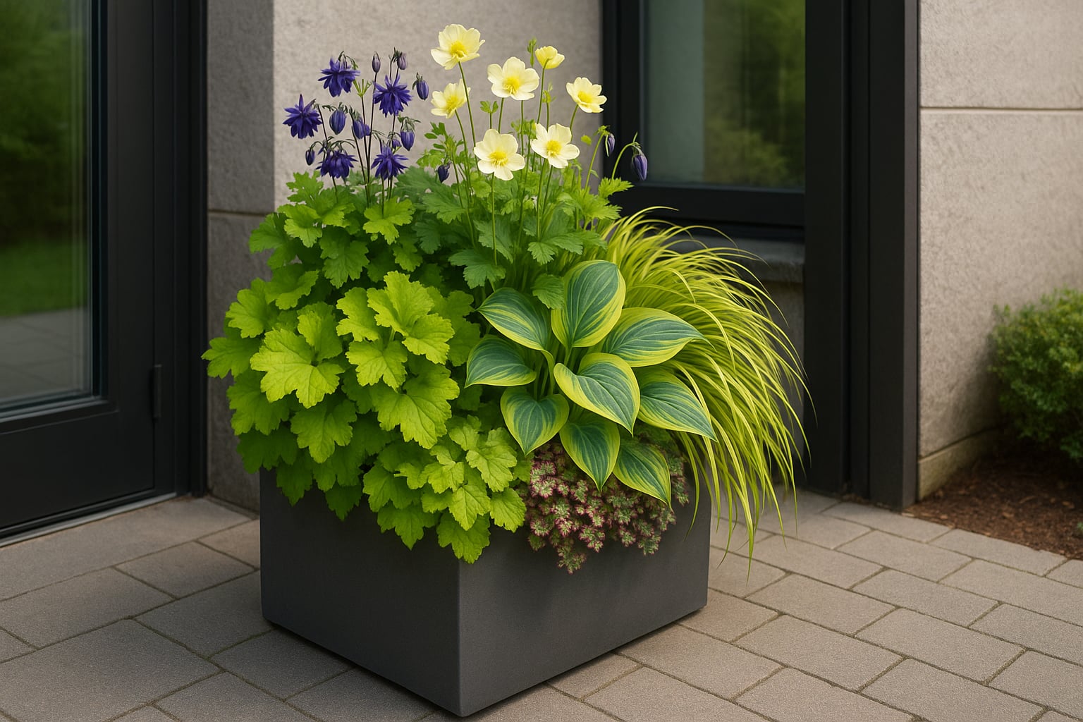 • Japán díszfű ‘Aureola’ (Hakonechloa macra ‘Aureola’) – lágyan ívelt, sárgás-zöld lomb. Inspirációként készítettünk egy konténeres beültetési tervet, melyet megtalálsz a képek között.