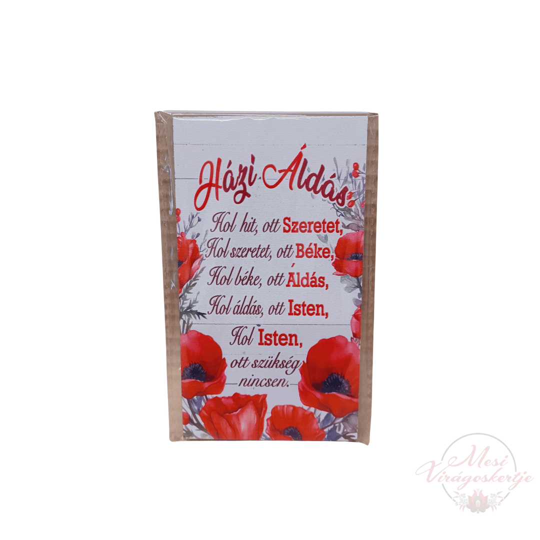 Házi áldás felirattal készült hűtőmágnes pipacsos mintával. Meleg hangulatú, szeretetteljes ajándék, amely békét és harmóniát hoz az otthonba.