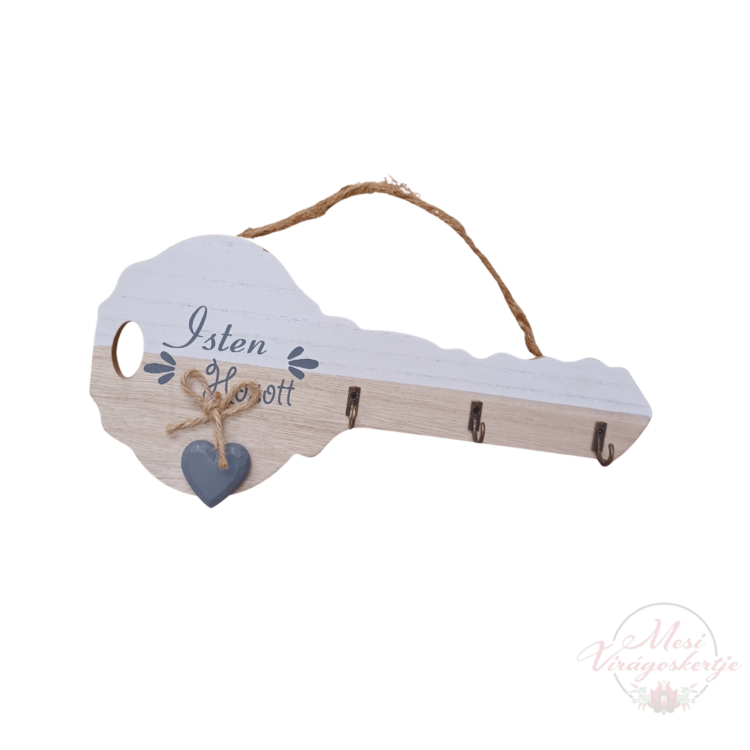 A „Isten hozott” fali kulcstartó természetes fa hatásával és szív motívumával barátságos, meghitt hangulatot teremt minden otthonban.