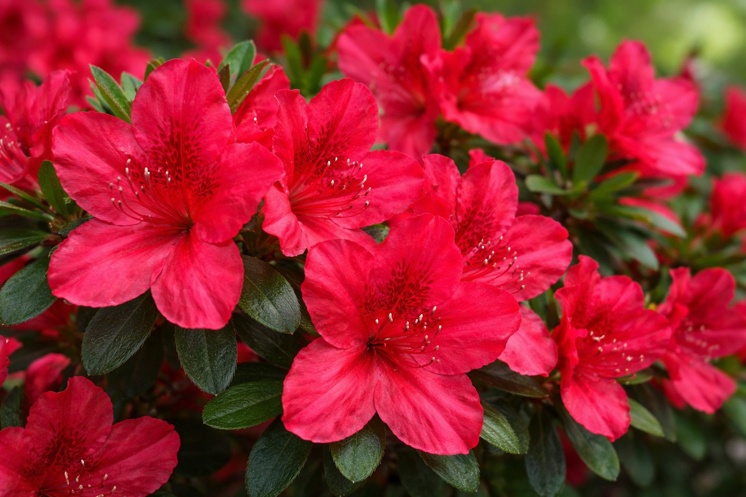 A japán azálea (Azalea japonica ‘Hino Crimson’) alacsony, kompakt növekedésű örökzöld díszcserje, amely tavasszal élénkpiros virágok tömegével borítja be a bokrot.