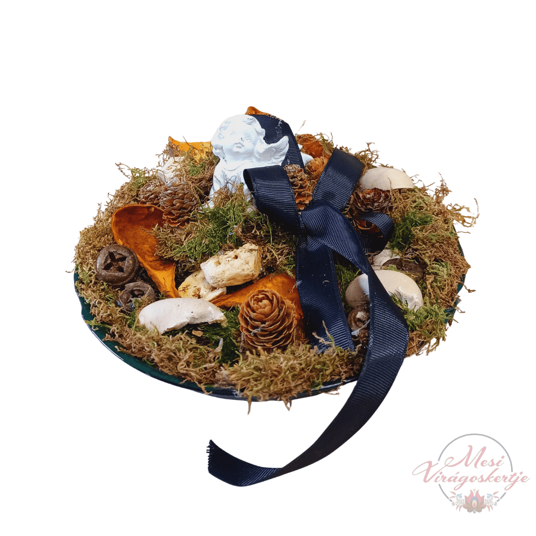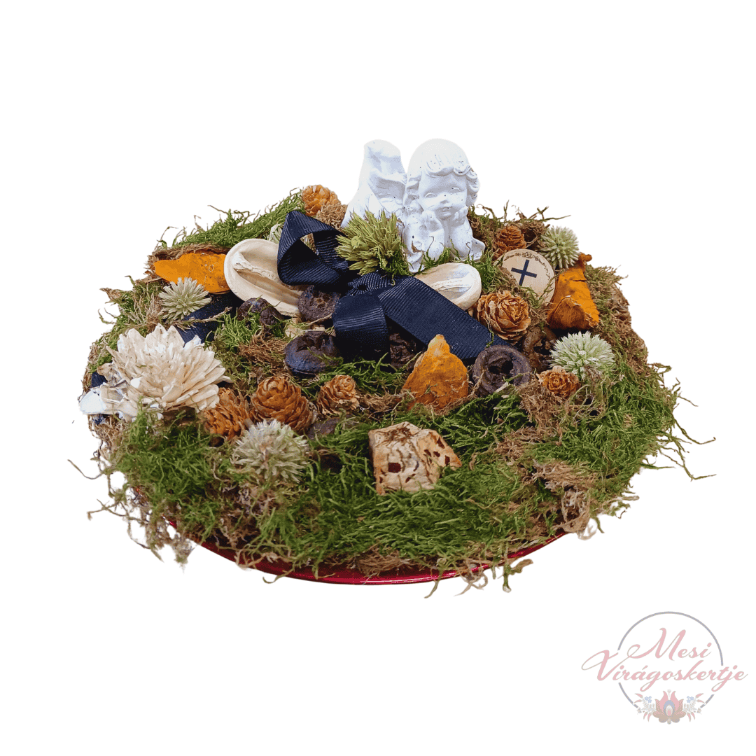 Egyedileg készített, többféle díszítésű kegyeleti dísz kerámia talpon. Természetes anyagokból, angyaldísszel és moha alappal, méltó megemlékezéshez.