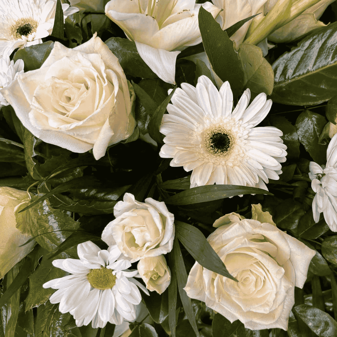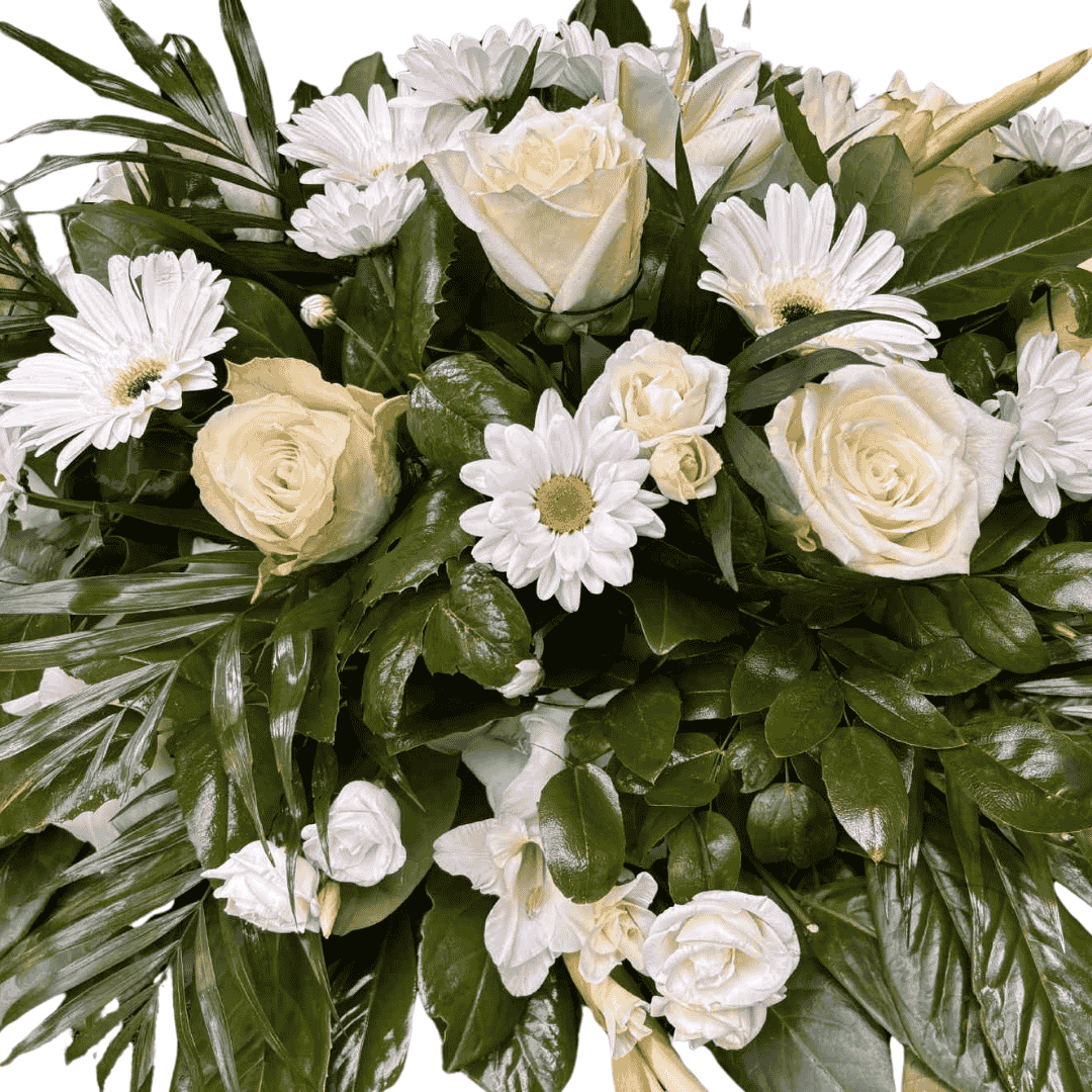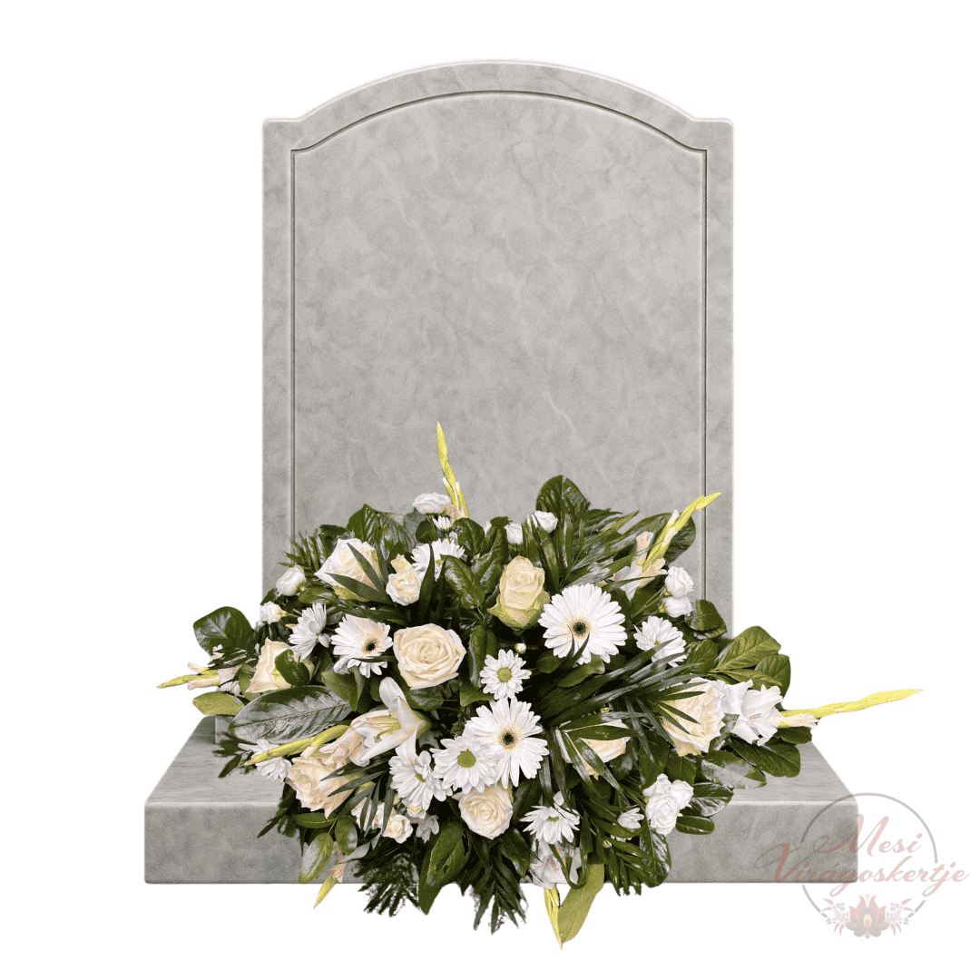 Ez bézs árnyalatú kegyeleti sírpárna egy gondosan összeállított virágkompozíció, amely a béke és nyugalom színeiben tiszteleg az elhunytak emléke előtt. A párna alapját friss, bézs tónusú virágok alkotják, kiegészítve zöld lombozattal és finom díszítőelemekkel.