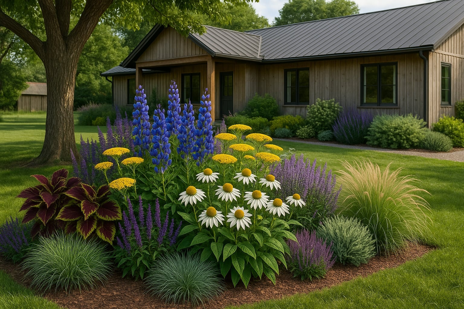• Színek: A mélykék virágok mellé jól illik a sárga cickafark (Achillea filipendulina) és a fehér kasvirág (Echinacea purpurea ‘White Swan’), amelyek kontrasztot és fényt hoznak.
