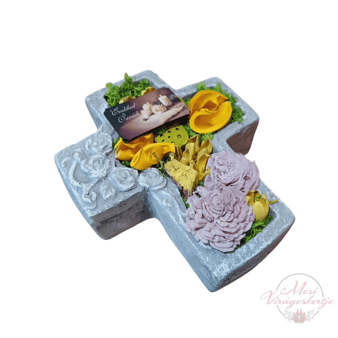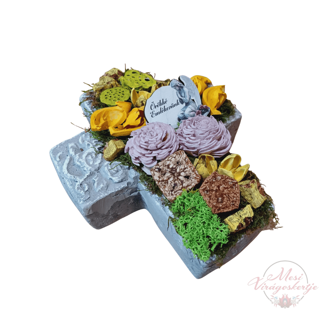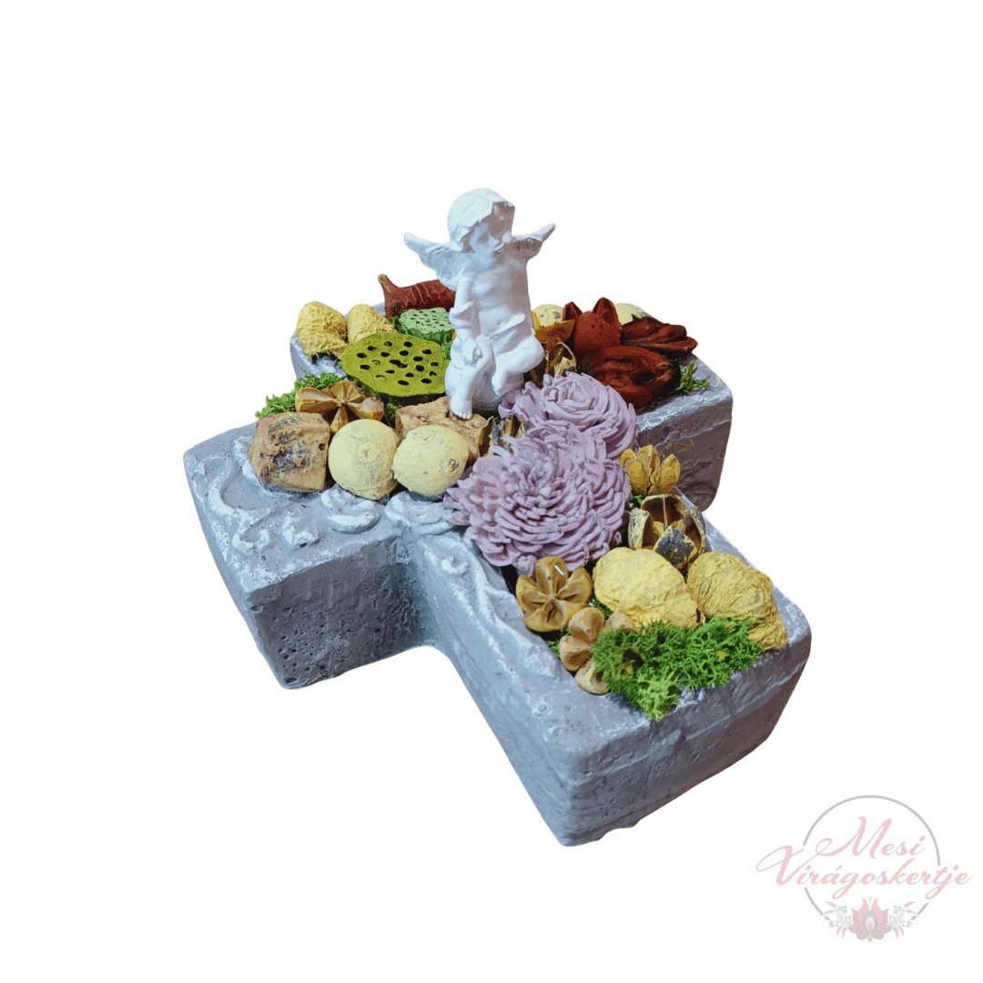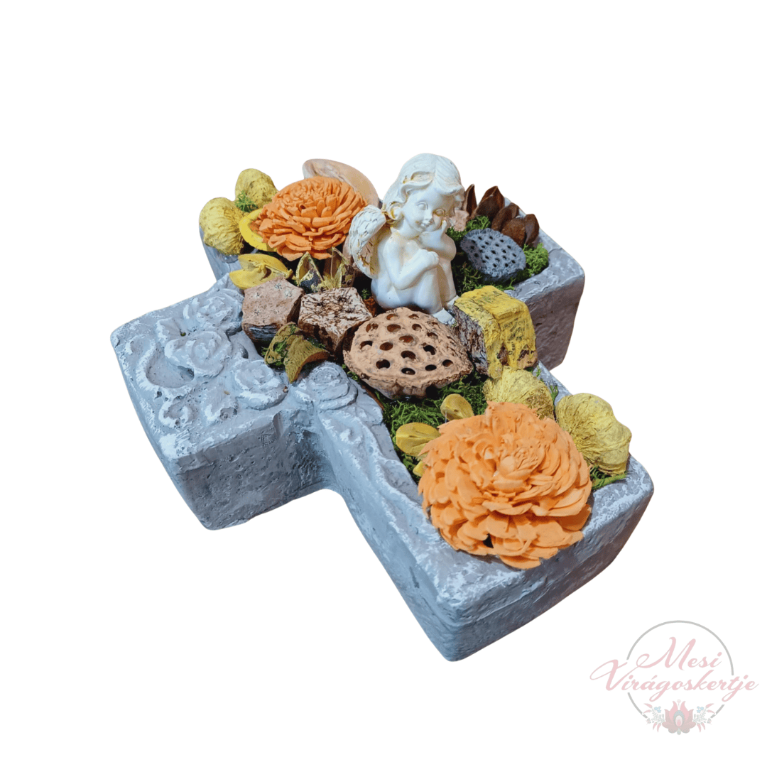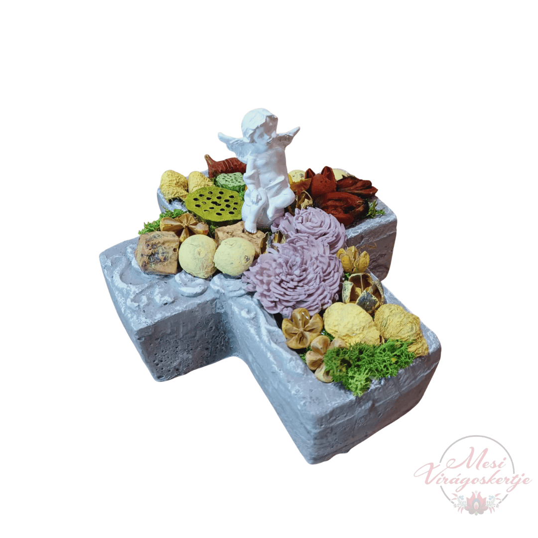 Ez az egyedi, kereszt alakú kegyeleti dekoráció egy világos tónusú, gipszből készült alapra épül, amelyet természetes száraz virágokkal, termésekkel, mohával és egy apró, fehér angyalszoborral, vagy emléktáblával díszítettünk.