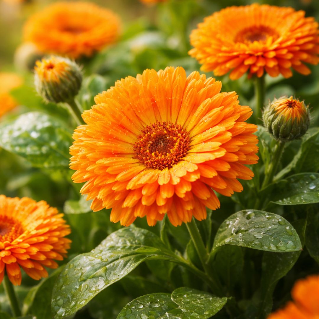 A körömvirág – Calendula officinalis klasszikus, megbízható egynyári növény, amely élénk narancssárga virágaival azonnal feldobja a környezetét. Kompakt növekedésű, bokros habitusú, ezért cserépben, balkonládában és kerti ágyásban is jól mutat.