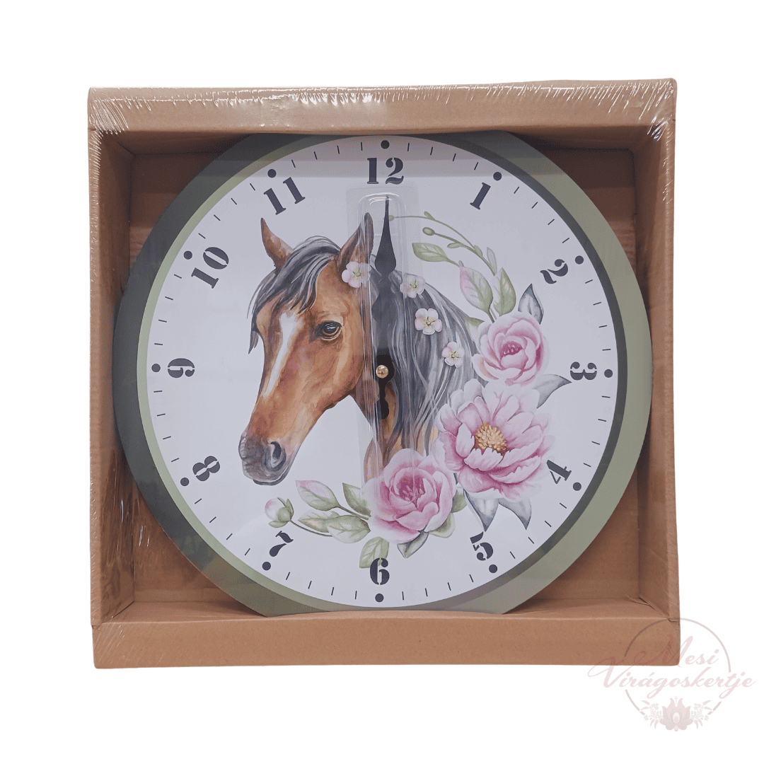 Fa falióra lófej és virágmintás motívummal. Természetes, romantikus hangulatú dekoráció, amely bármely helyiséget egyedivé varázsol.