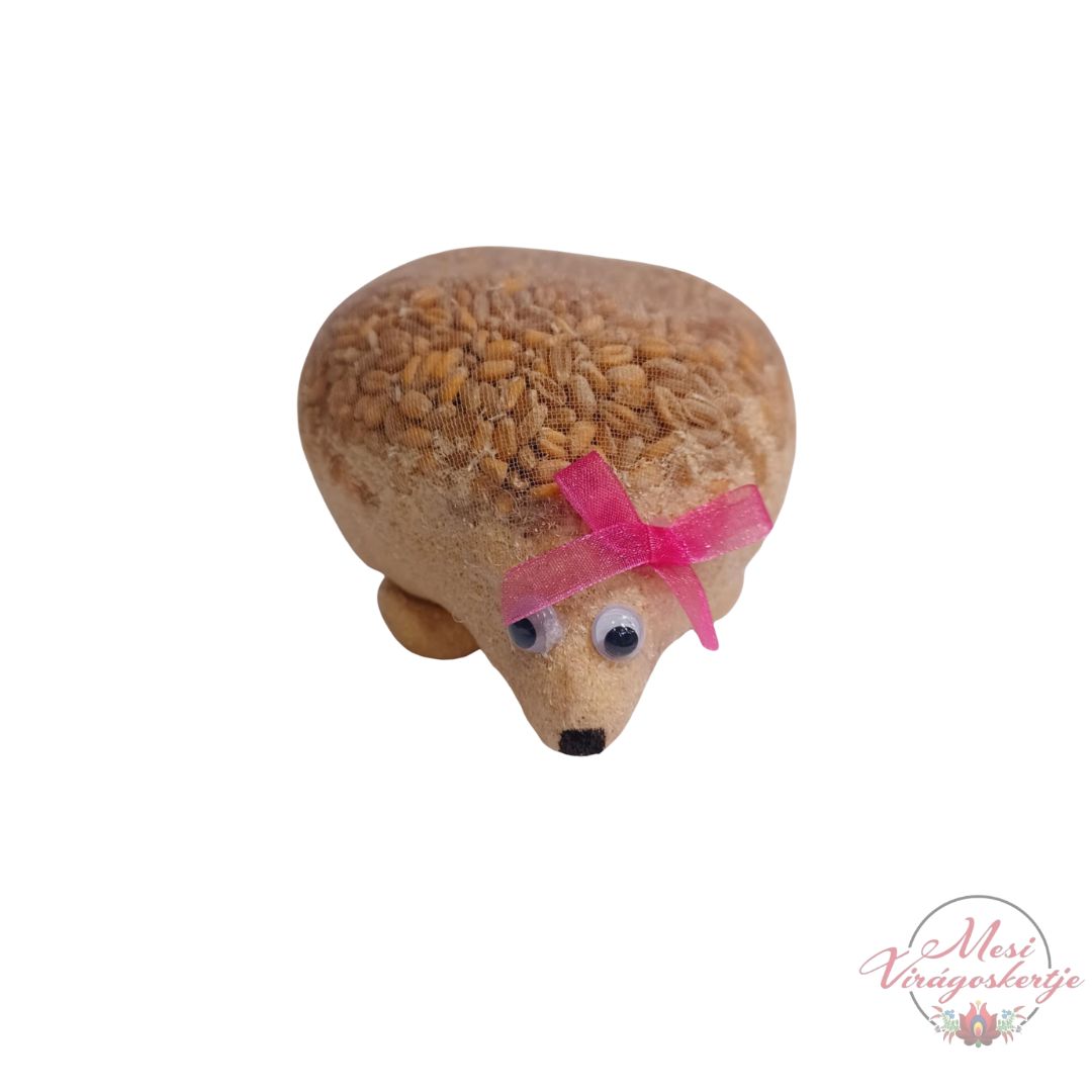 A figura természetes búzamagokból álló „tüskés” felületet kapott, amelyet finom háló borít, hogy formája szép és tartós maradjon. A rózsaszín masni játékos karaktert ad neki, a mozgó szemek pedig élettelivé teszik az arcát. Ideális választás adventi időszakra, Luca napjára, ajándéknak vagy évközi kedves dekorációnak is.