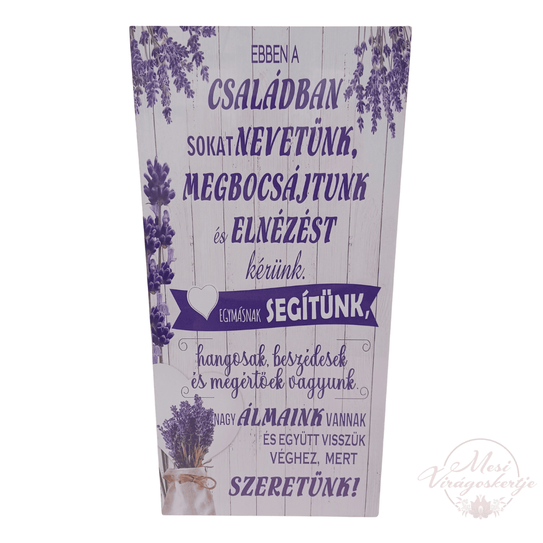 A Motivációs tábla levendulás mintával és szeretetteljes üzenettel a család értékeit idézi. Otthonos, szívhez szóló ajándék bármely alkalomra.