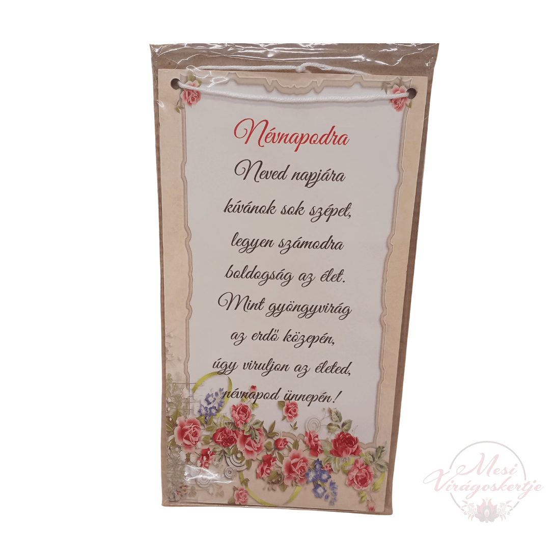 A névnapi áldás falitábla elegáns, virágmintás dísz, mely meghitt hangulatot áraszt. Tökéletes névnapi ajándék, ami szeretetet és gondoskodást sugároz.
