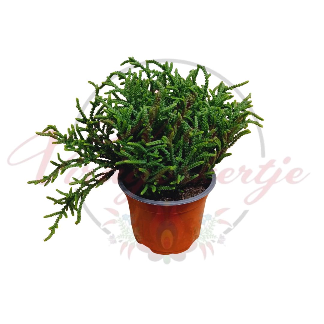 A patkányfarkú pozsgafa (Crassula muscosa) egy igazán különleges megjelenésű pozsgás növény, amely sűrűn elágazó, apró levelekből álló hajtásaival leginkább egy miniatűr fenyőre vagy mohapárnára emlékeztet. Sajátos formája miatt gyakran választják modern, letisztult enteriőrökbe, ahol textúrájával és élénk zöld színével különleges hangsúlyt ad.
