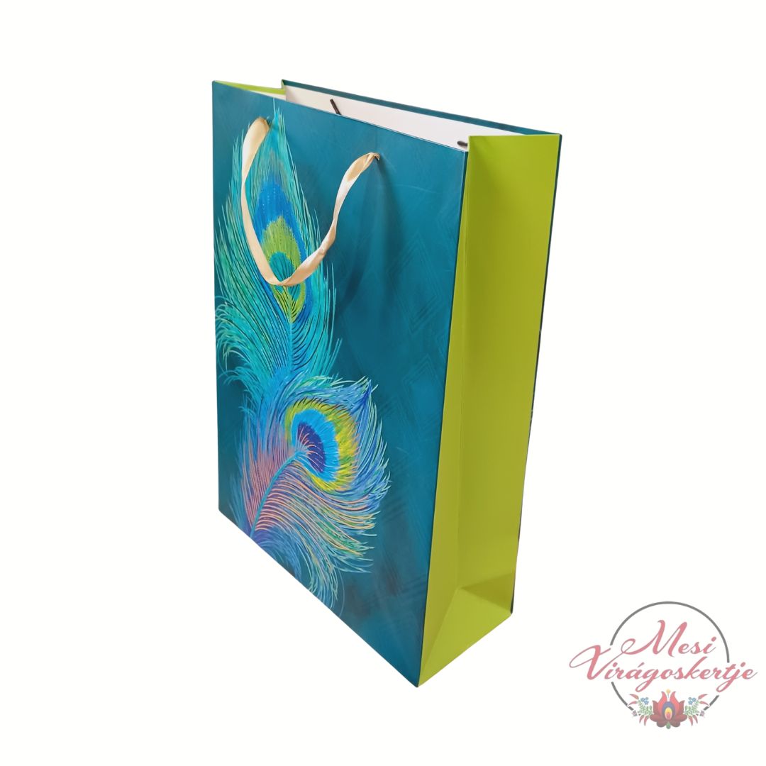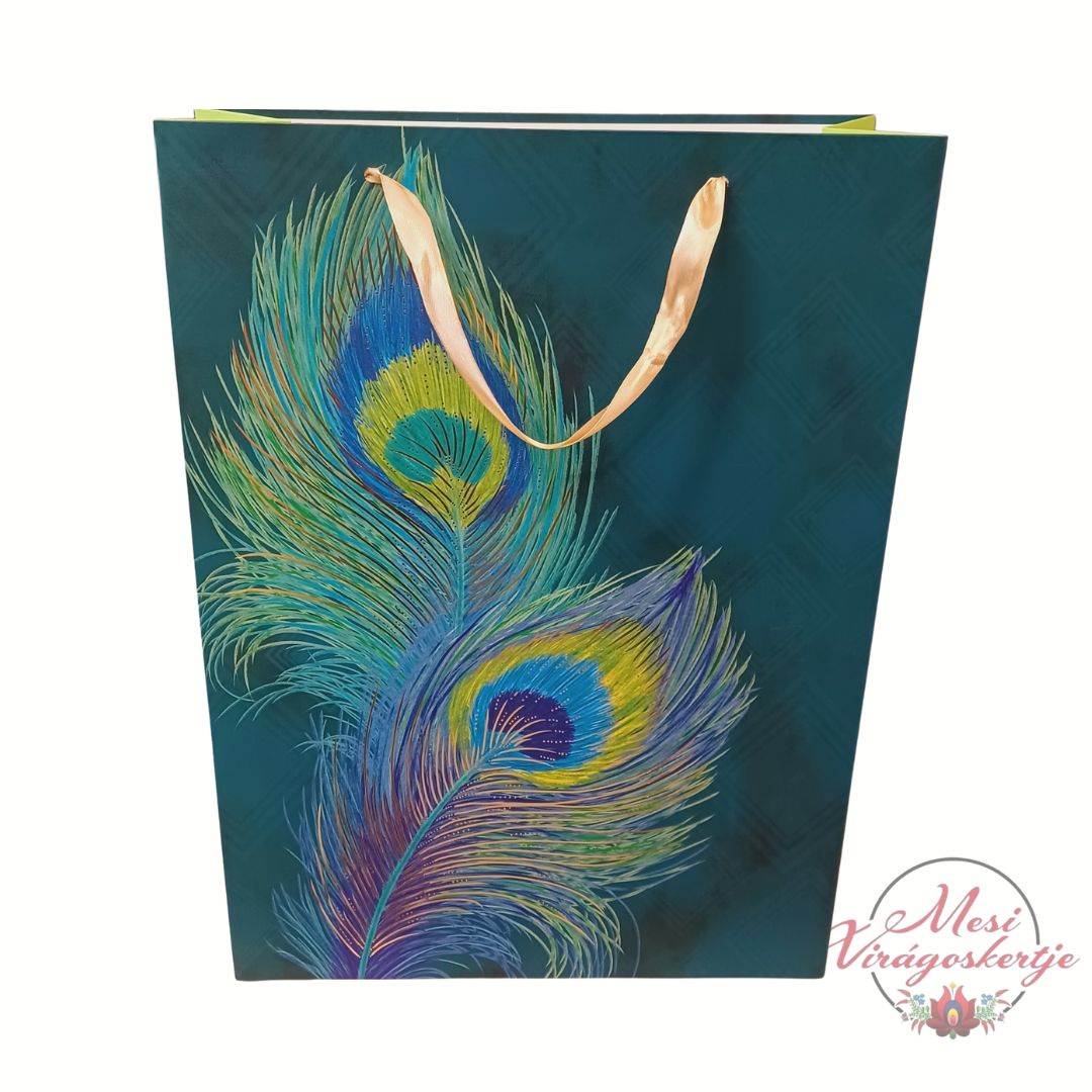 Elegáns, pávatoll mintás ajándéktáska különleges alkalmakra. Stílusos, erős kivitelű táska, amely önmagában is ajándékhatású.