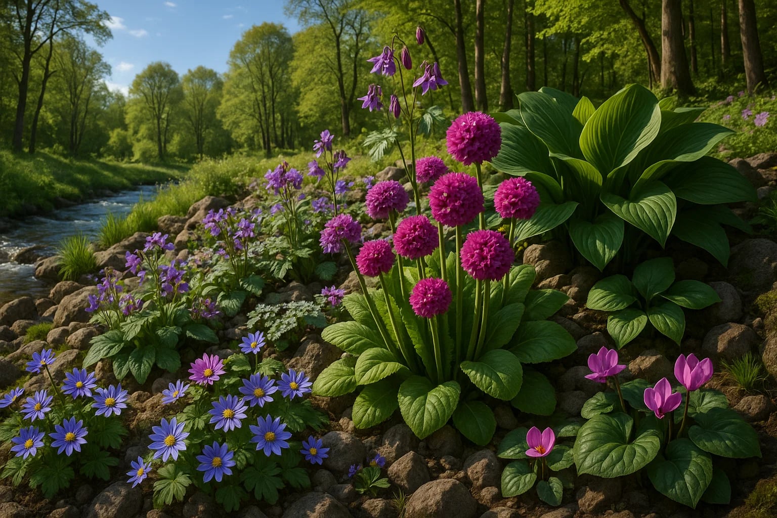 • Tüdőfű (Pulmonaria officinalis): Foltos levelei és kora tavaszi virágzása harmonizál a Primula színeivel.