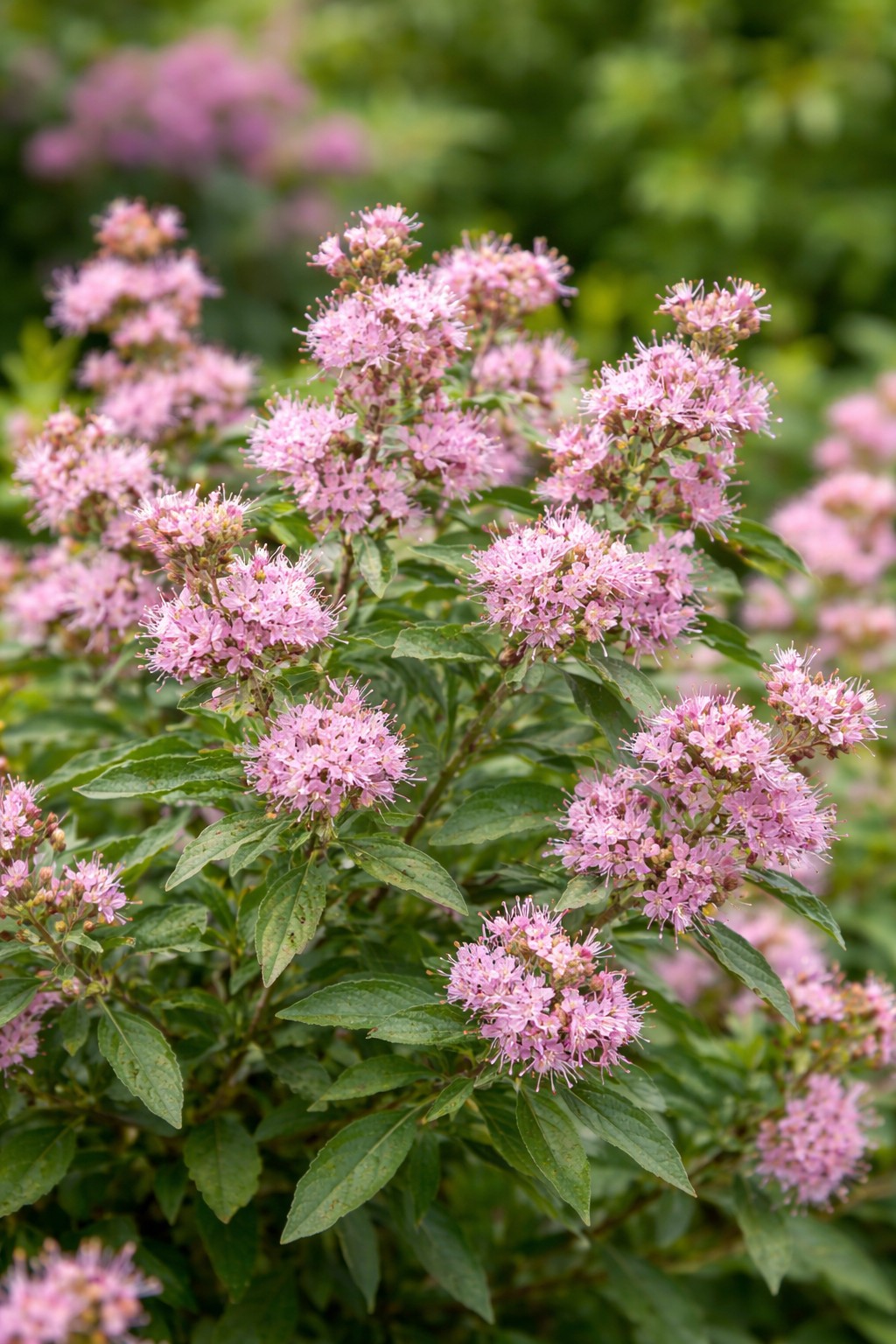 Kompakt növekedésű, rózsaszín virágú kékszakáll, amely nyár végétől őszig díszíti a kertet