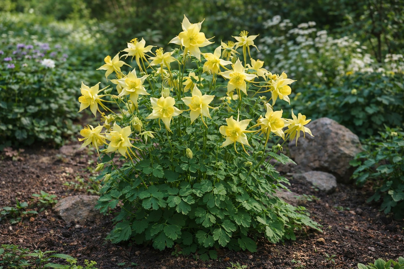 A Sárga harangláb ‘Spring Magic Yellow’ – Aquilegia egy különleges, tavasszal virágzó évelő dísznövény, amely könnyed megjelenésével és elegáns virágaival a természetközeli kertek egyik kedvelt növénye. Finom, csillag alakú virágai világos sárga színben nyílnak, és légies hatást keltenek a virágágyásokban.