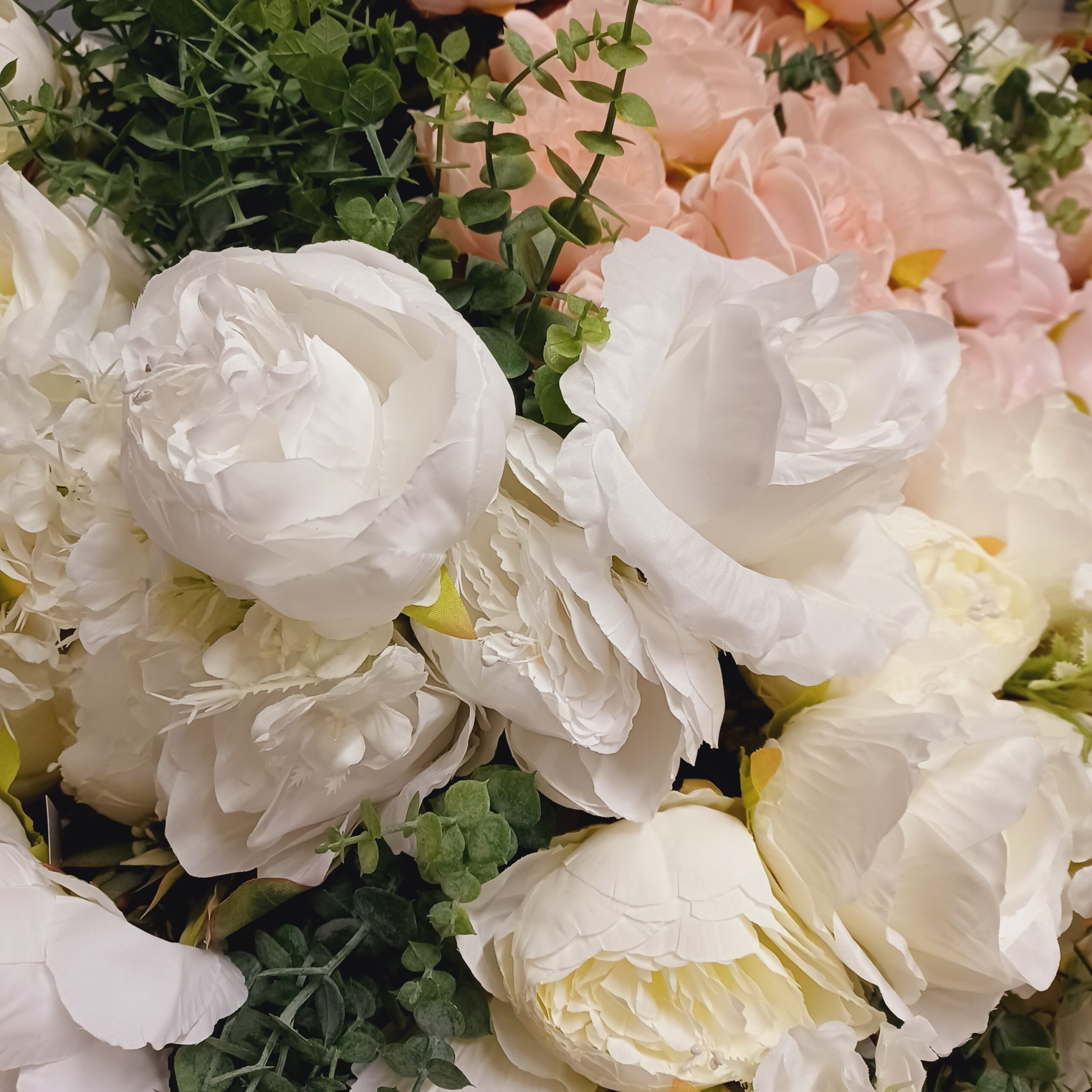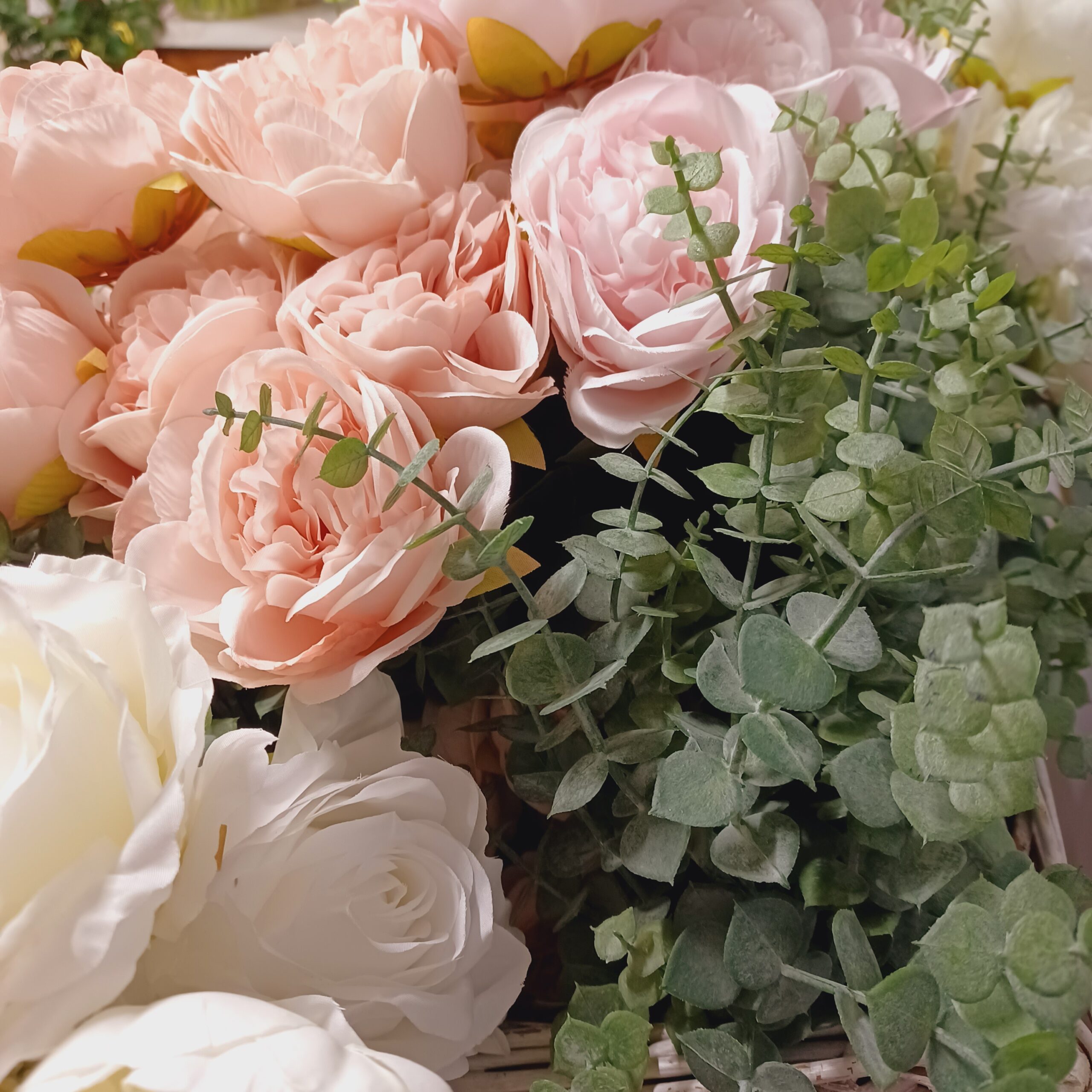 A képen látható kompozíciónkat eukaliptusz műággal komponáltuk. Próbáld ki Te is bármelyik selyemvirággal kedved szerint.
