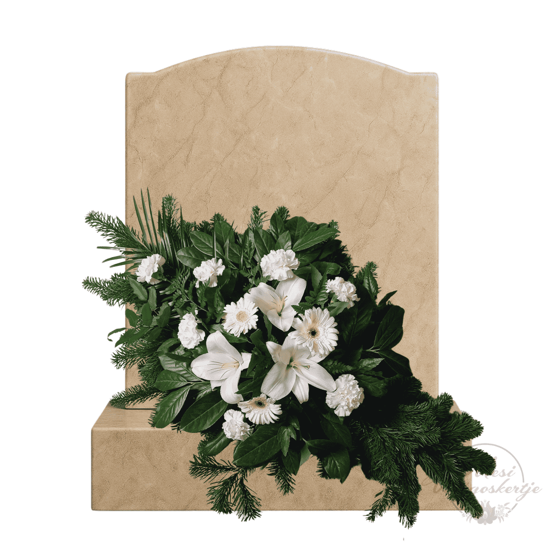 A gyász pillanataihoz méltó, elegáns megemlékezés ez a fehér sírcsokor élővirágokból, amelyet Mesi Virágoskertje készít gondos odafigyeléssel és szeretettel. A kompozícióban fehér liliomok, gerberák és szegfűk kaptak helyet, melyeket zöld fenyőágak és dús lomb egészít ki, természetes, harmonikus összhatást teremtve.