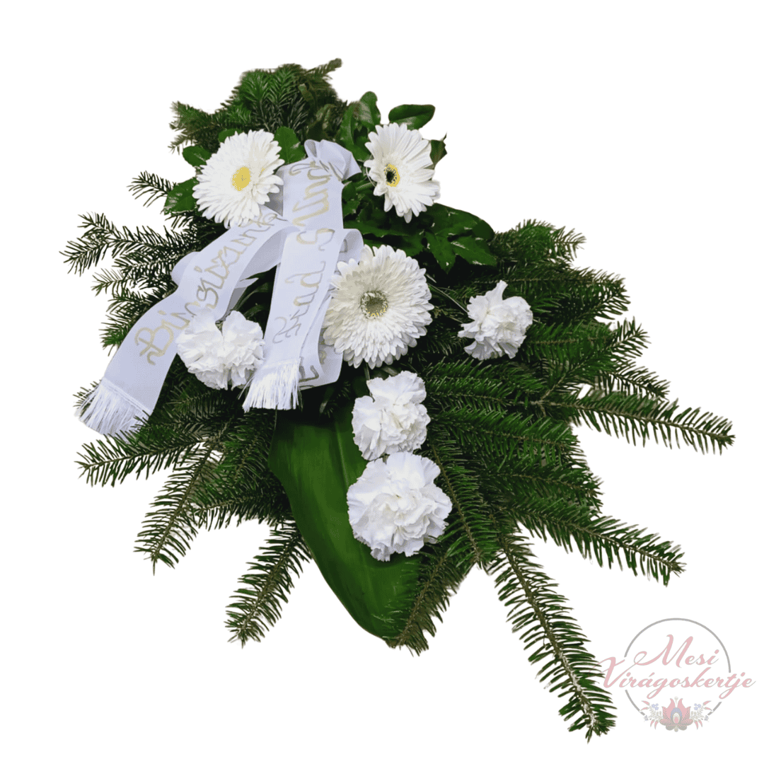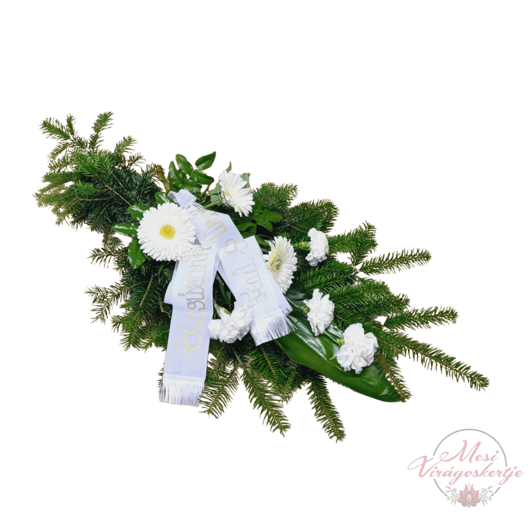 Élő virágokból (4 szál szegfű, 3 szál gerbera, lucfenyő alapon, díszítéssel, gyászszalaggal) készült sírcsokor fehér színekben. Klasszikus, természetes dísz a tiszteletteljes megemlékezéshez és sírdíszítéshez.