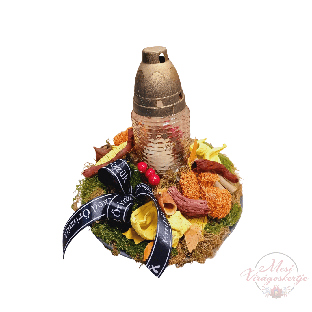 Ez az elegáns sírdísz egy bronz színű mécsestartót helyez a kompozíció középpontjába, amelyet zöld moha borította kör alapra rögzítettek. A dekorációt szárított virágok, narancskarikák, vörös bogyók, barna potpourri elemek és sárga mesterséges virágok egészítik ki, természetes és meleg tónusokat kölcsönözve az elrendezésnek. A fekete szalag fehér „Nyugodj békében” felirattal méltóságteljes keretet ad az emlékezésnek.