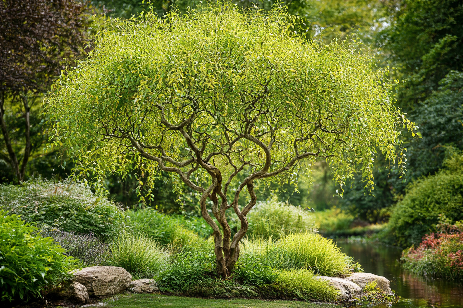 A spirálfűz jól mutat Japán nőszirom – Iris ensata és Kálmos – Acorus gramineus társaságában