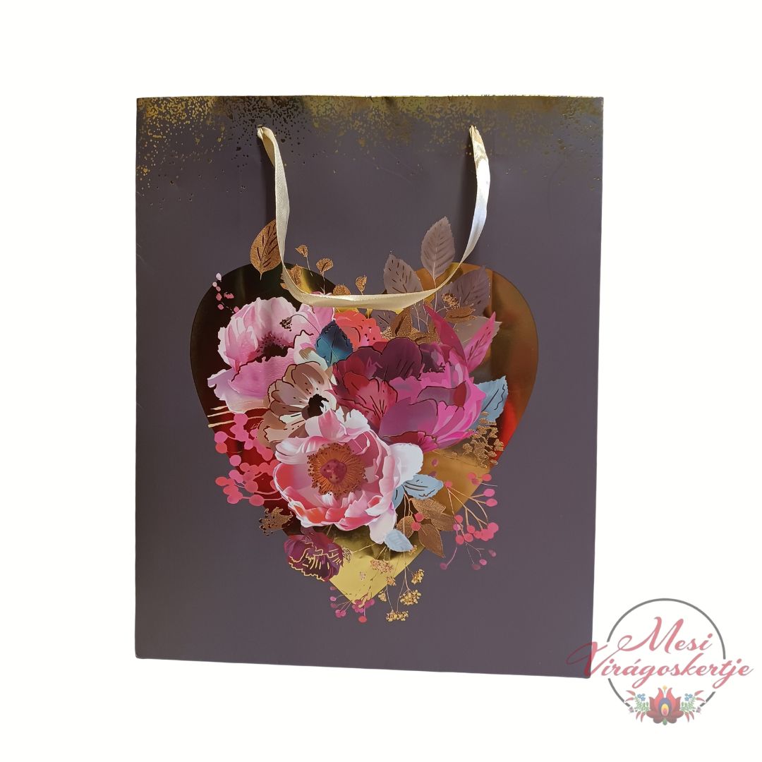 Ez a szív alakú mintával díszített ajándéktáska igazán elegáns és érzelmes választás, ha az ajándékozásnak különleges hangulatot szeretnénk adni. A gazdag virágkompozíció és az arany árnyalatú részletek harmonikus összhangot alkotnak a sötét háttérrel, így a táska már önmagában is ajándéknak hat.