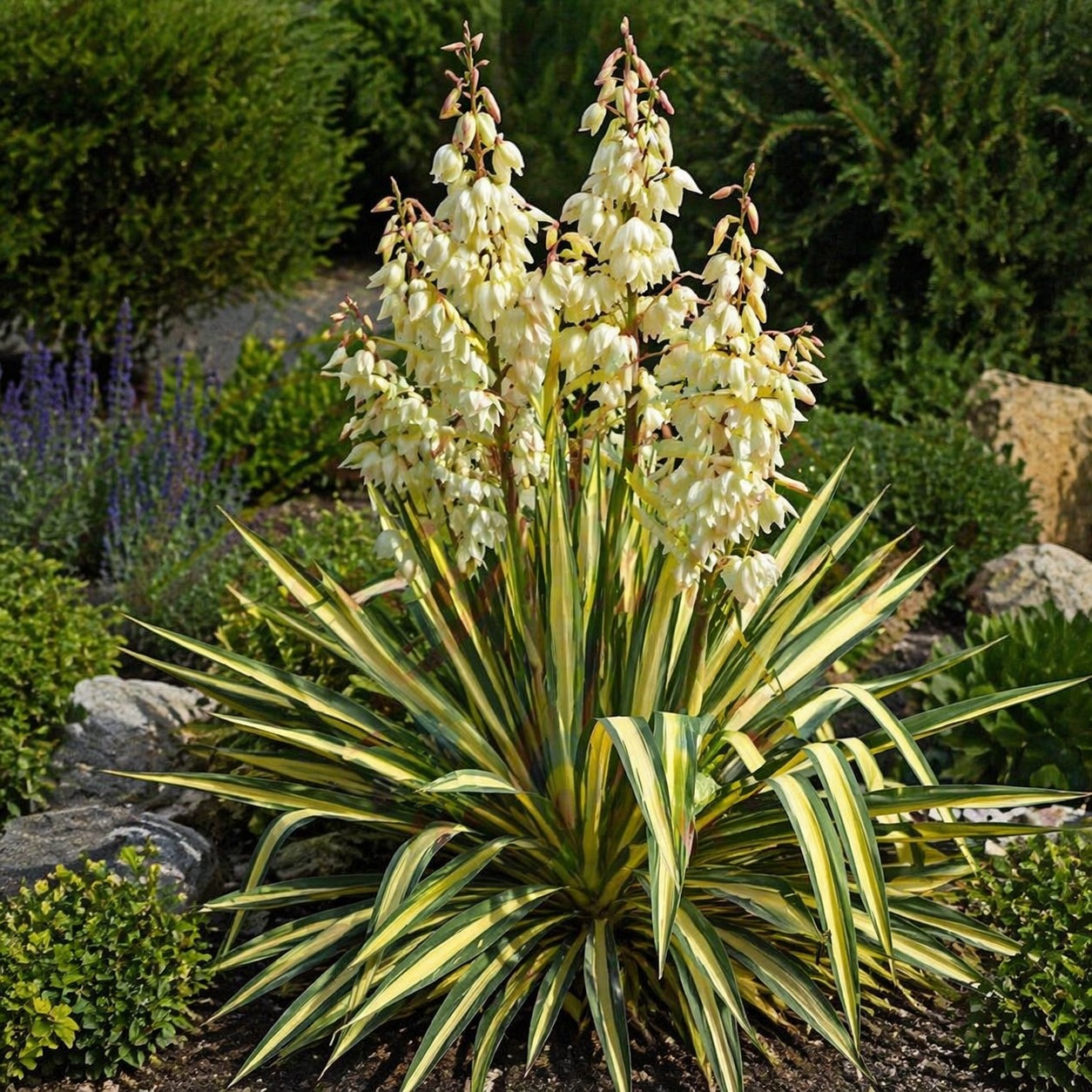Látványos, tarka levelű pálmaliliom, amely egész évben díszít. Ideális napos, szárazabb kertekbe és modern ágyásokba.