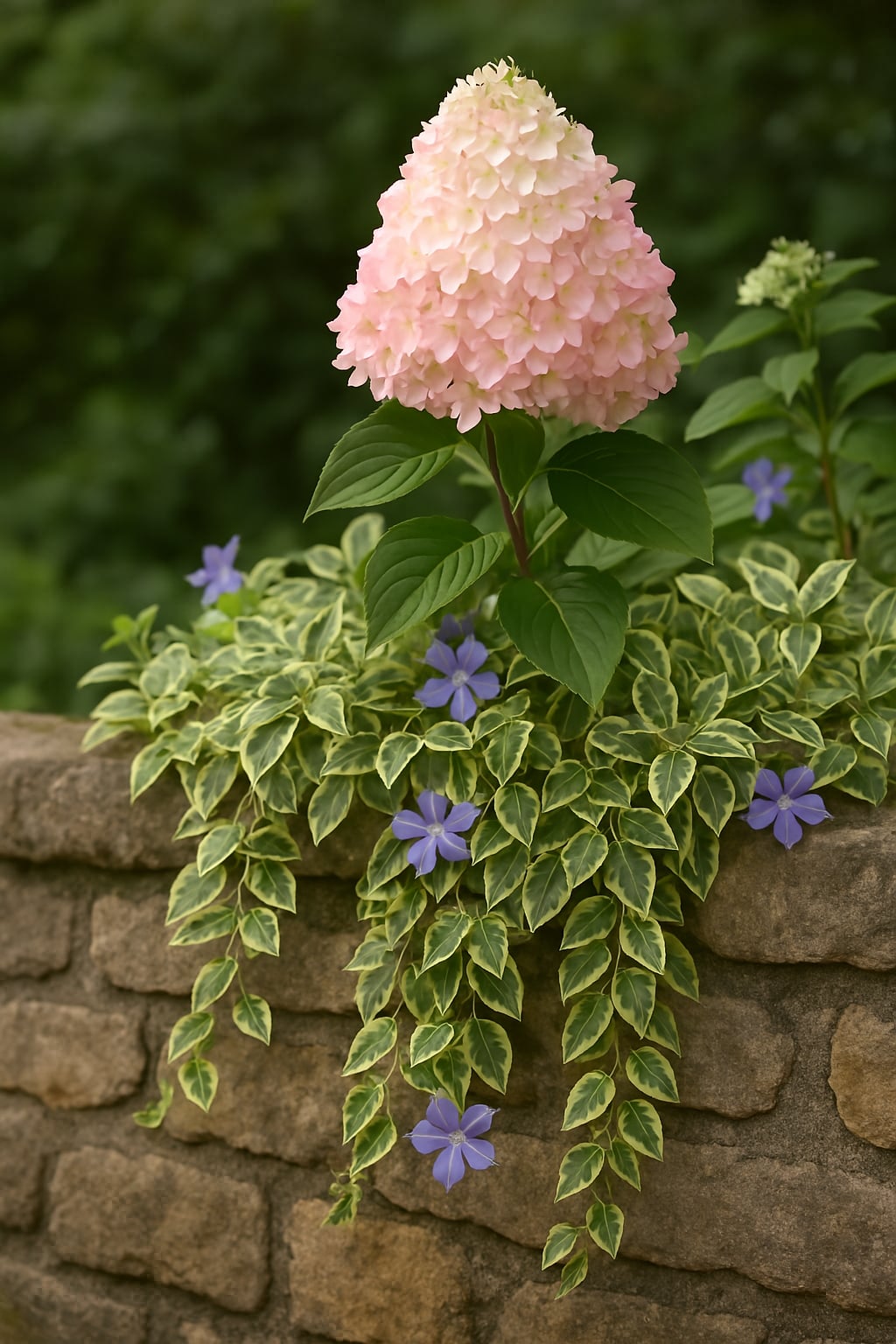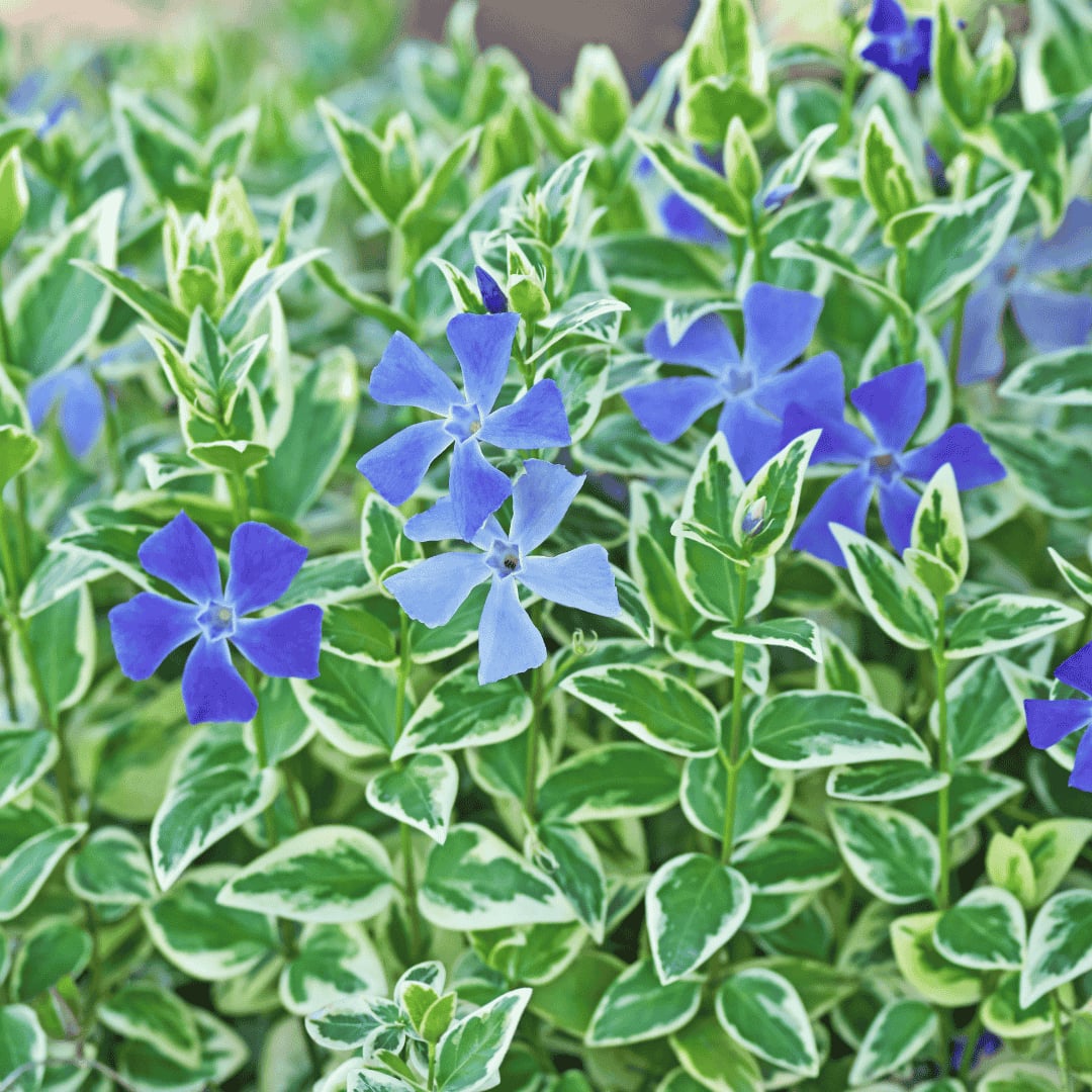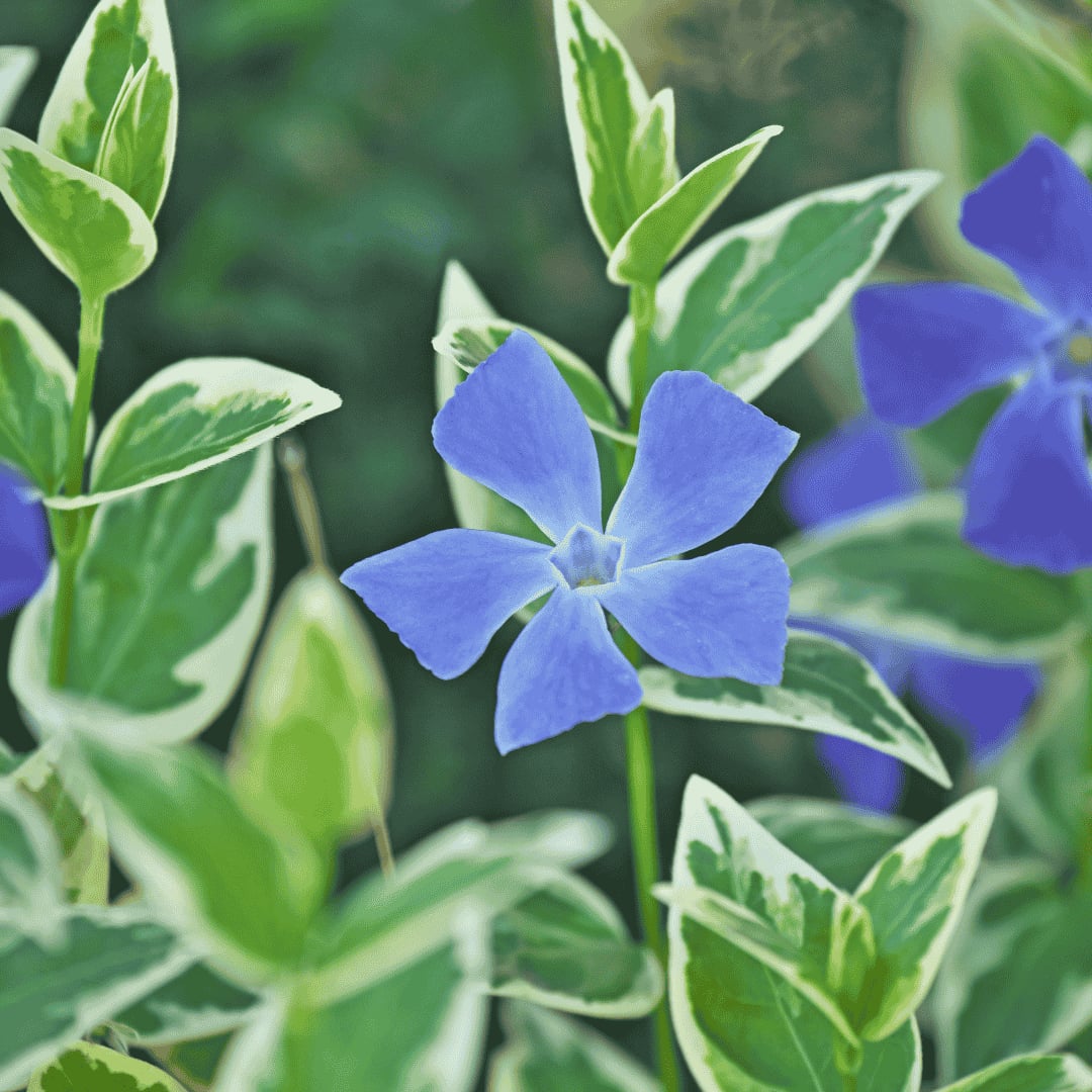 A Tarka levelű nagy meténg – Vinca major ‘Variegata’ sárgás-fehér szegélyű leveleivel és kék virágaival egész évben díszítő, árnyéktűrő talajtakaró növény.
