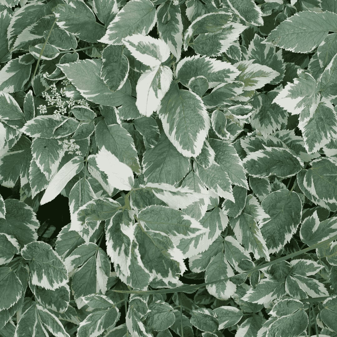 A Tarka podagrafű – Aegopodium podagraria ‘Variegata’ életerős, fagytűrő talajtakaró évelő, amely árnyékos helyen is díszít krémszínű-zöld leveleivel.