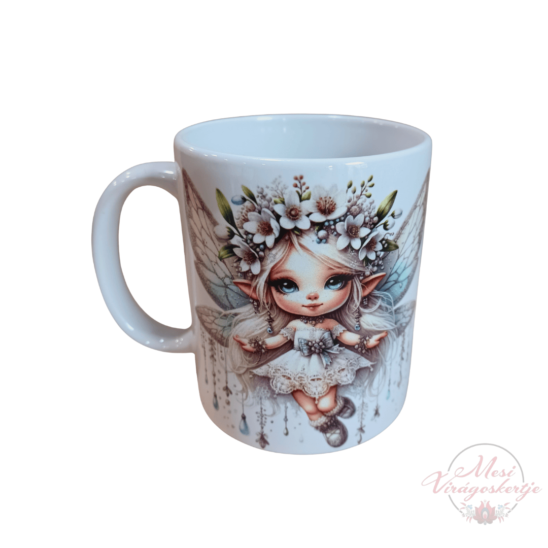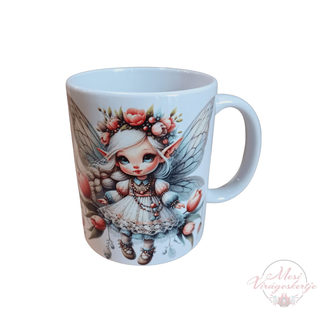 A tündér nagy, kifejező szemekkel és áttetsző szárnyakkal jelenik meg, körülötte rózsaszín tulipánok és finom, csillogó díszítőelemek teszik teljessé a kompozíciót. Az illusztráció részletgazdag, akvarell stílusban készült, így a bögre nemcsak praktikus, hanem vizuálisan is lenyűgöző.